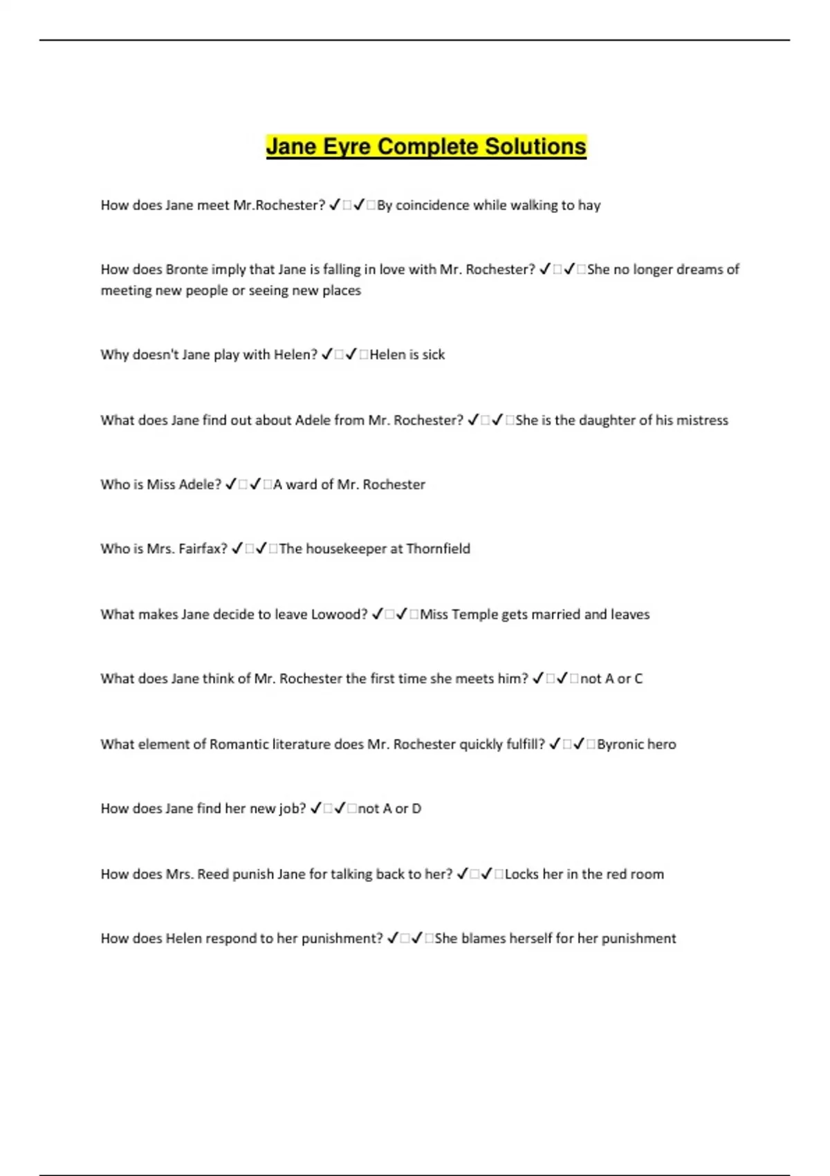 Jane Eyre Complete Solutions How does Jane meet Mr.Rochester? ️️By coincidence while walking to hay How does Bronte imply that Jane is falling in love with Mr. Rochester? ️️She no longer dreams of meeting new people or seeing new places Why doesn't Jane play with Helen? ️️Helen is sick What does Jane find out about Adele from Mr. Rochester? ️️She is the daughter of his mistress Who is Miss Adele? ️️A ward of Mr. Rochester Who is Mrs. Fairfax? ️️The housekeeper at Thornfield What makes Jane decide to leave Lowood? ️️Miss Temple gets married and leaves What does Jane think of Mr. Rochester the first time she meets him? ️️not A or C What element of Romantic literature does Mr. Rochester quickly fulfill? ️️Byronic hero How does Jane find her new job? ️️not A or D How does Mrs. Reed punish Jane for talking back to her? ️️Locks her in the red room How does Helen respond to her punishment? ️️She blames herself for her punishment How is Jane hurt at Gateshead? ️️John Reed throws a book at her How does Mr. Brocklehurst punish Jane? ️️Makes her stand on a stool all day What best describes Lowood? ️️A charity school for orphaned girls What best describes Jane? ️️Simple, plain, but intelligent Who befriends Jane at Lowood? ️️Helen Burns Why is Jane at Gateshall? ️️Being an orphan, her uncle Mr. Reed promised to care for her What is unusual about Jane's journey to Lowood? ️️She rides alone on a 50 mile journey What does Jane think school will be like at Lowood? ️️Girls will learn to paint and speak French Who comes to Thornfield while Mr. Rochester is away on business? ️️A gypsy fortune-teller What does the gypsy tell Miss Ingram that makes her unhappy? ️️That Thornfield is not worth as much as she thought What happens to Mr. Mason late one night at Thornfield? ️️He is injured and Jane must tend to his wounds Why does Jane finally tell Mr. Rochester of her feelings for him? ️️She believes she will be leaving for Ireland soon After learning about Bertha at the wedding and Thornfield, what does Jane decide to do? ️️Run away from Thornfield and Mr. Rochester What directions are Jane and Mr. Mason given while they wait for the Mr. Rochester to return? ️️They are not to speak about what has happened What news does John the carriage man bring to Jane? ️️John Reed has died and Mrs. Reed is dying How does Mr. Rochester react to the news that Mr. Mason has arrived at Thornfield? ️️He is shaken and must sit down Upon her return to Thornfield, what does Mr. Rochester lead her to believe? ️️She is no longer welcome at Thornfield What news does Jane get from Mrs. Reed upon her deathbed? ️️Her uncle has made her his heir, but Mrs. Reed has told him she is dead How does Jane gain financial independence? ️️Her uncle leaves her 20 thousand pounds What does Jane tell St. John and his sisters of her past? ️️She is an or