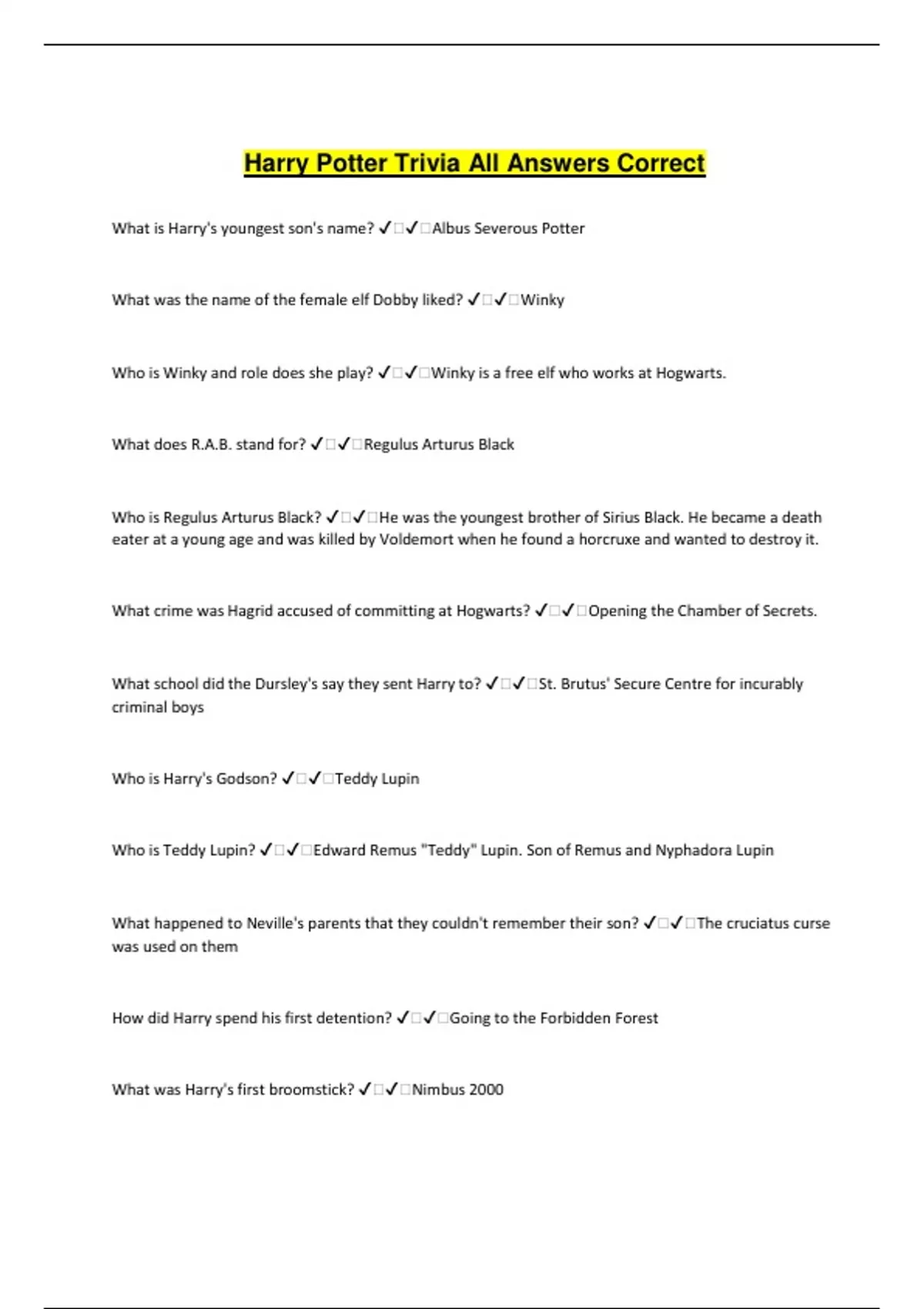 Harry Potter Trivia All Answers Correct What is Harry's youngest son's name? ️️Albus Severous Potter What was the name of the female elf Dobby liked? ️️Winky Who is Winky and role does she play? ️️Winky is a free elf who works at Hogwarts. What does R.A.B. stand for? ️️Regulus Arturus Black Who is Regulus Arturus Black? ️️He was the youngest brother of Sirius Black. He became a death eater at a young age and was killed by Voldemort when he found a horcruxe and wanted to destroy it. What crime was Hagrid accused of committing at Hogwarts? ️️Opening the Chamber of Secrets. What school did the Dursley's say they sent Harry to? ️️St. Brutus' Secure Centre for incurably criminal boys Who is Harry's Godson? ️️Teddy Lupin Who is Teddy Lupin? ️️Edward Remus "Teddy" Lupin. Son of Remus and Nyphadora Lupin What happened to Neville's parents that they couldn't remember their son? ️️The cruciatus curse was used on them How did Harry spend his first detention? ️️Going to the Forbidden Forest What was Harry's first broomstick? ️️Nimbus 2000 What magazine does Luna's father publish? ️️The Quibbler What is Luna's fathers name? ️️Xenophilius Lovegood What spell is used to save Hermione from the troll in The Sorcerer's Stone? ️️Wingardium Leviosa Who did Ron turn into when Harry, Ron, and Hermione snuck into The Ministry of Magic in the Deathly Hallows? ️️Reginald Cattermole How did Harry survive underwater in the Triwizard Tournament? ️️Gillyweed Who found Harry, Ron, and Hermione in the woods in The Deathly Hallows? ️️Fenrir Greyback Who is Fenrir Greyback? ️️The werewolf that infected Remus Lupin. What did Dumbledore leave for Hermione in his will? ️️The Tales of Beedle the Bard Who needed up giving Harry permission to go to Hogsmeade? ️️Sirius Black Who was the first to be stunned by the Basilisk? ️️Mrs. Norris Who is Mrs. Norris? ️️The pet cat of Argus Filch Who did Hermione take to Slughorn's Christmas Party? ️️Cormac McLaggen Who is Cormac McLaggen? ️️A wizard from the Gryffindor house. What was the Slughorn's Christmas Party? ️️Professor Horace Slughorn hosted a Christmas Party for the Slug Club and invited guests in his office. What was the Slug Club? ️️An informal club that included Professor Horace Slughorn's favorite students. What potion did Harry take in order to get Professor Slughorn's memories? ️️Felix Felicis What organization did Hermione start in her 4th year? ️️Society For The Promotion of Elfish Welfare Who disguised himself as Mad Eye Moody in the Goblet of Fire? ️️Barty Crouch Jr. Who is Barty Crouch Jr.? ️️Bartemius "Barty" Crouch Jr. He joined Lord Voldemort to become a Death Eater. He allegedly participated in the capture and torture of Frank and Alice Longbottom along with the Lestranges. Who was the Quidditch commentator in Harry's first year at Hogwarts? ️️Lee Jordan What patronus does Luna Lovegood have? ️️Rabbit What patronus does Harry have? ️️A Stag / Deer Who's birthday party did Harry, Ron, and Hermione go to in The Chamber of Secrets? ️️Nearly Headless Nick What patronus does Hermione have? ️️Otter What patronus does Ron have? ️️Jack Russell Terrier What patronus does Albus Dumbledore have? ️️Phoenix