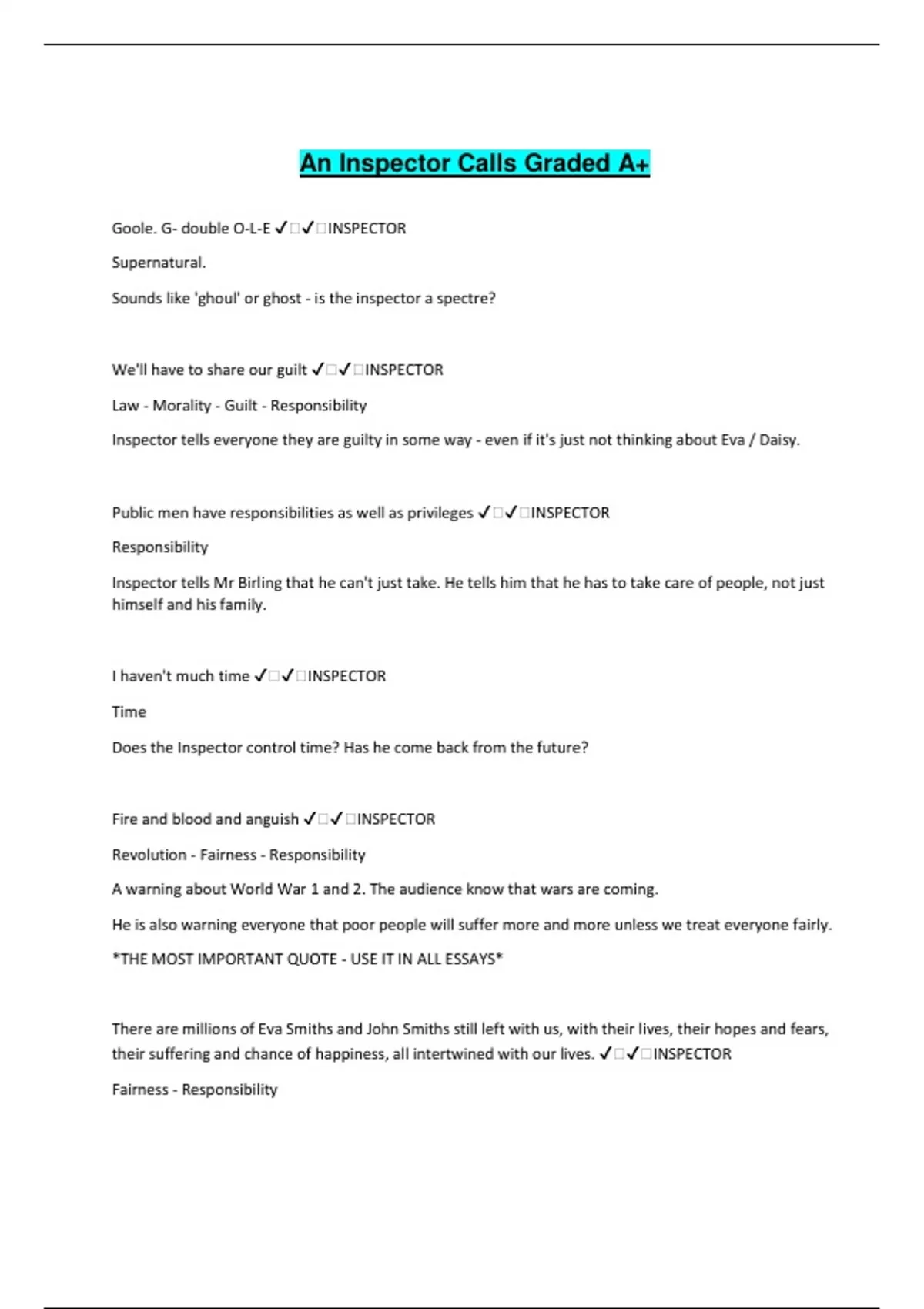 An Inspector Calls Graded A+ Goole. G- double O-L-E ️️INSPECTOR Supernatural. Sounds like 'ghoul' or ghost - is the inspector a spectre? We'll have to share our guilt ️️INSPECTOR Law - Morality - Guilt - Responsibility Inspector tells everyone they are guilty in some way - even if it's just not thinking about Eva / Daisy. Public men have responsibilities as well as privileges ️️INSPECTOR Responsibility Inspector tells Mr Birling that he can't just take. He tells him that he has to take care of people, not just himself and his family. I haven't much time ️️INSPECTOR Time Does the Inspector control time? Has he come back from the future? Fire and blood and anguish ️️INSPECTOR Revolution - Fairness - Responsibility A warning about World War 1 and 2. The audience know that wars are coming. He is also warning everyone that poor people will suffer more and more unless we treat everyone fairly. *THE MOST IMPORTANT QUOTE - USE IT IN ALL ESSAYS* There are millions of Eva Smiths and John Smiths still left with us, with their lives, their hopes and fears, their suffering and chance of happiness, all intertwined with our lives. ️️INSPECTOR Fairness - Responsibility Eva may have dies but she is just an example of all the people who have no rights, no power. The Inspector tells us we must look after everyone, not just our family and friends. We are members of one body. We are responsible for each other. ️️INSPECTOR Responsibility The Inspector tells us we must look after everyone, not just our family and friends. I speak as a hard-headed businessman ️️MR BIRLING Money - Power - Materialistic (cares about things not people / passions) Mr Birling believes his advice and opinion should be taken on everything because he owns a business. He is very proud to be a capitalist (money maker) and wealthy. The Titanic... unsinkable, absolutely unsinkable ️️MR BIRLING Lack of awareness Priestley shows the audience how wrong Mr Birling is. If he's wrong about The Titanic, he's wrong about everything else (like looking after only yourself, Socialism and taking care of poorer people). Girls of that class... ️️MR BIRLING Class Mr B shows that he thinks less of working class people, and that he is above them. He thinks "they" behave differently (and worse) than those of his class. I'd give thousands ️️MR BIRLING Money - Regret - Responsibility Mr Birling uses money to demonstrate how much he'd like things to be different. It shows he is money centred. It shows he takes some responsibility, but only a bit. A man has to mind his own business and look after himself and his own. ️️MR BIRLING Responsibility Mr B says we only have to look after our family and friends - but nobody else. This is exactly the opposite of what the Inspector says about looking after everyone. If you don't come down hard on these people, they'll soon be asking for the earth. ️️MR BIRLING Class - Money Mr Birling talks about working class as "these people" like they're different to and less than him. He also misses the point that these people have nothing and Eva was only asking for a little extra money. a fair chance I might find my way into the next Honours List. ️️MR BIRLING Class - Money - Power Mr Birling is expecting to be made a knight or a sir. It shows that he is powerful. However, it also shows that he is worried about his status and knows he's 'below' Lord & Lady Croft. The whole story's just a lot of moonshine. ️️MR BIRLING Responsibility - Law He is relieved when it appears that the Inspector is not real and the story was made up. He thinks he can just carry on as before (unlike Sheila and Eric) as the "public scandal" was the thing he really cared about. public scandal ️️MR BIRLING Money - Power - Class Mr Birling is terrified there will be a scandal which drags his name through the mud. He cares more about what people think of him than he does a girl's death. You talk as if we were responsible. ️️SHEILA Responsibility Near the start... Sheila doesn't see how the Birlings are to blame (but soon changes her mind). These girls aren't cheap labour - they're people. ️️SHEILA