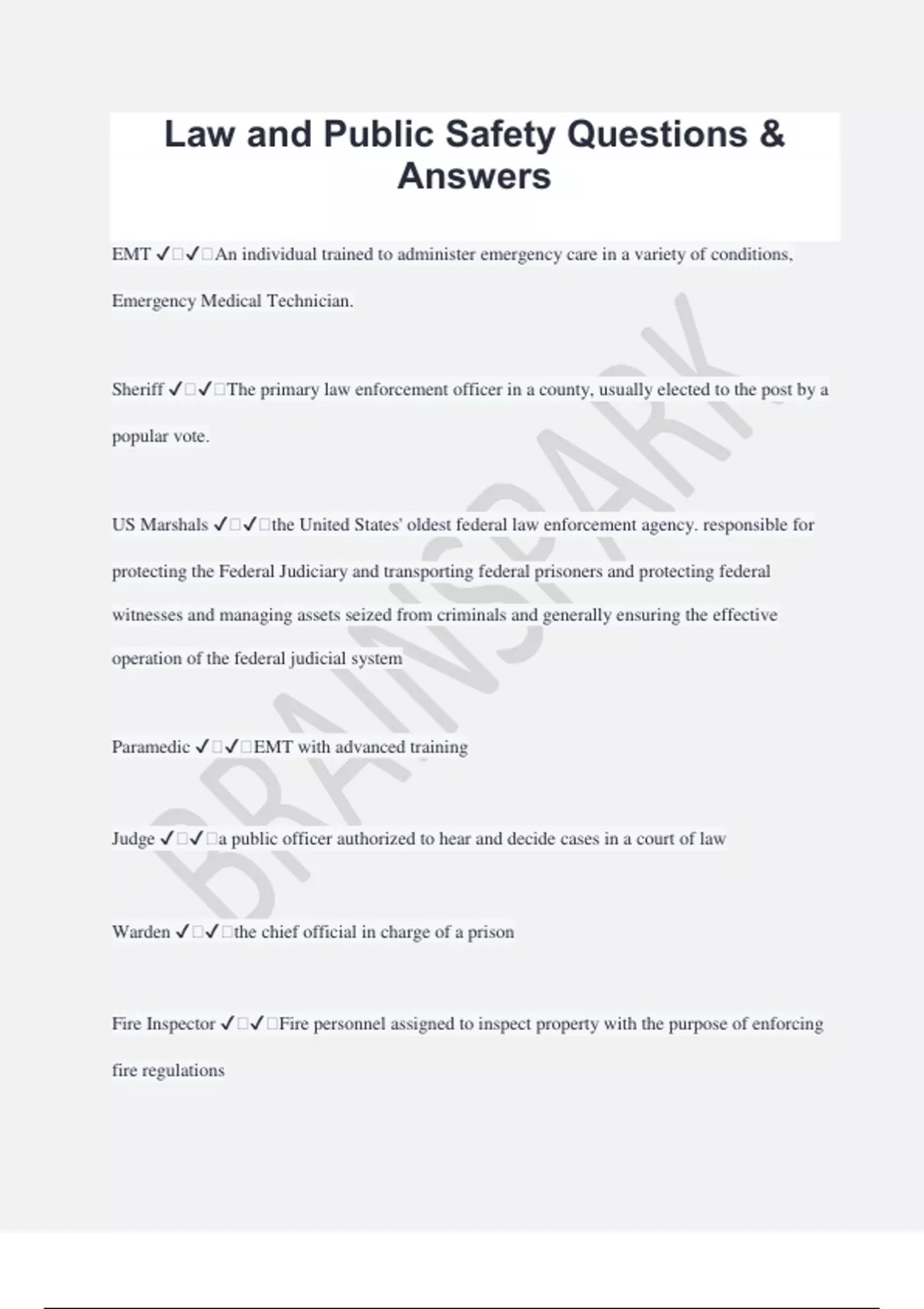 Law and Public Safety Questions & Answers EMT ️️An individual trained to administer emergency care in a variety of conditions, Emergency Medical Technician. Sheriff ️️The primary law enforcement officer in a county, usually elected to the post by a popular vote. US Marshals ️️the United States' oldest federal law enforcement agency. responsible for protecting the Federal Judiciary and transporting federal prisoners and protecting federal witnesses and managing assets seized from criminals and generally ensuring the effective operation of the federal judicial system