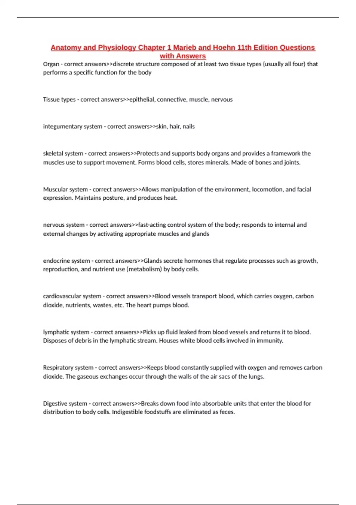 Anatomy and Physiology Chapter 1 Marieb and Hoehn 11th Edition Questions with Answers Organ - correct answers>>discrete structure composed of at least two tissue types (usually all four) that performs a specific function for the body Tissue types - correct answers>>epithelial, connective, muscle, nervous integumentary system - correct answers>>skin, hair, nails skeletal system - correct answers>>Protects and supports body organs and provides a framework the muscles use to support movement. Forms blood cells, stores minerals. Made of bones and joints. Muscular system - correct answers>>Allows manipulation of the environment, locomotion, and facial expression. Maintains posture, and produces heat. nervous system - correct answers>>fast-acting control system of the body; responds to internal and external changes by activating appropriate muscles and glands endocrine system - correct answers>>Glands secrete hormones that regulate processes such as growth, reproduction, and nutrient use (metabolism) by body cells. cardiovascular system - correct answers>>Blood vessels transport blood, which carries oxygen, carbon dioxide, nutrients, wastes, etc. The heart pumps blood. lymphatic system - correct answers>>Picks up fluid leaked from blood vessels and returns it to blood. Disposes of debris in the lymphatic stream. Houses white blood cells involved in immunity. Respiratory system - correct answers>>Keeps blood constantly supplied with oxygen and removes carbon dioxide. The gaseous exchanges occur through the walls of the air sacs of the lungs. Digestive system - correct answers>>Breaks down food into absorbable units that enter the blood for distribution to body cells. Indigestible foodstuffs are eliminated as feces.