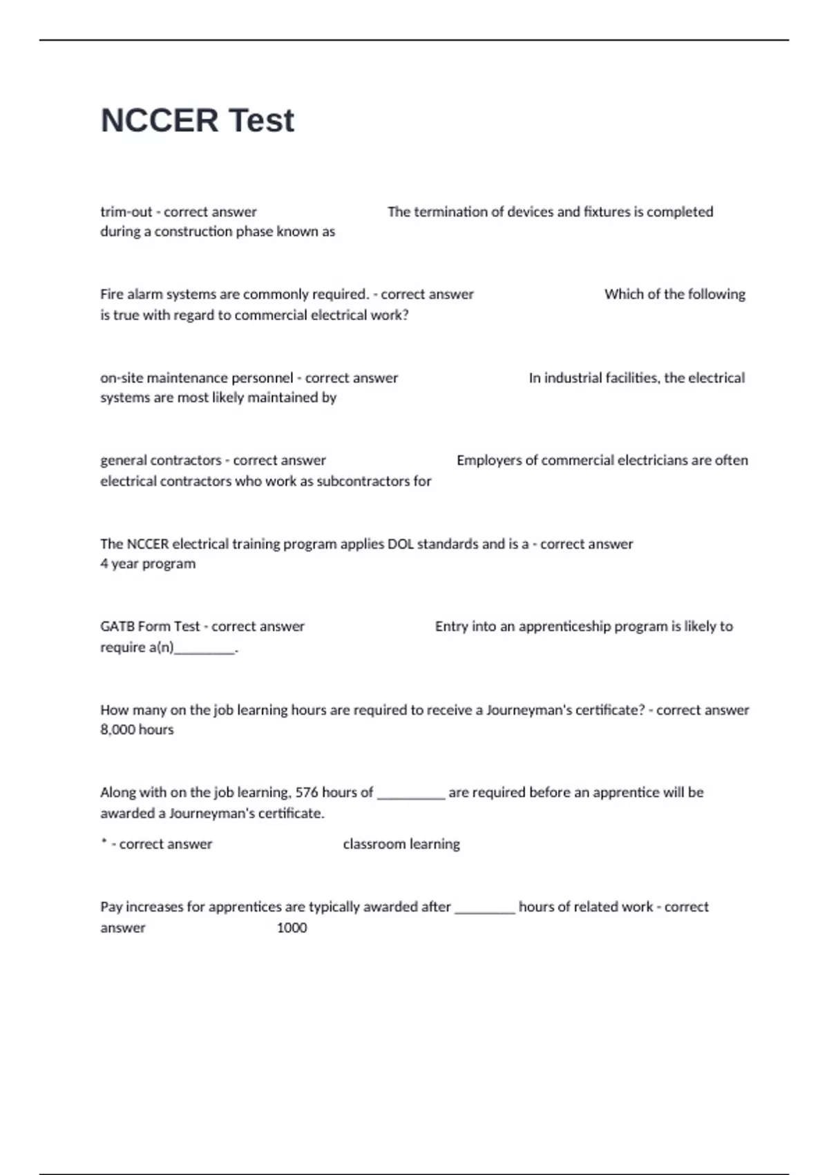 trim-out - correct answer The termination of devices and fixtures is completed during a construction phase known as Fire alarm systems are commonly required. - correct answer Which of the following is true with regard to commercial electrical work? on-site maintenance personnel - correct answer In industrial facilities, the electrical systems are most likely maintained by general contractors - correct answer Employers of commercial electricians are often electrical contractors who work as subcontractors for The NCCER electrical training program applies DOL standards and is a - correct answer 4 year program GATB Form Test - correct answer Entry into an apprenticeship program is likely to require a(n)________. How many on the job learning hours are required to receive a Journeyman's certificate? - correct answer 8,000 hours Along with on the job learning, 576 hours of _________ are required before an apprentice will be awarded a Journeyman's certificate. * - correct answer classroom learning Pay increases for apprentices are typically awarded after ________ hours of related work - correct answer 1000