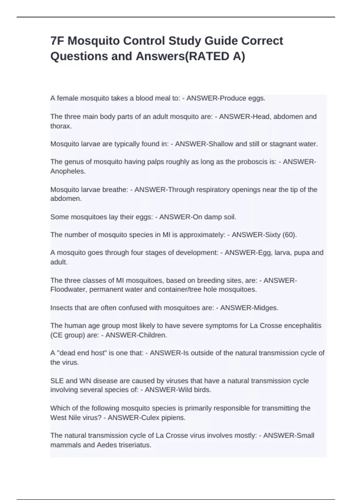 A female mosquito takes a blood meal to: - ANSWER-Produce eggs.
