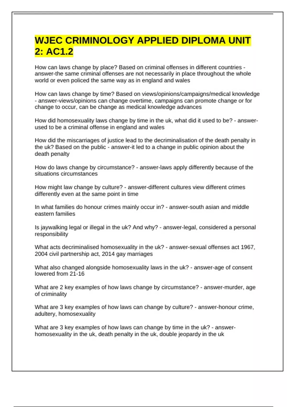 How can laws change by place? Based on criminal offenses in different countries - answer-the same criminal offenses are not necessarily in place throughout the whole world or even policed the same way as in england and wales How can laws change by time? Based on views/opinions/campaigns/medical knowledge - answer-views/opinions can change overtime, campaigns can promote change or for change to occur, can be change as medical knowledge advances How did homosexuality laws change by time in the uk, what did it used to be? - answer-used to be a criminal offense in england and wales How did the miscarriages of justice lead to the decriminalisation of the death penalty in the uk? Based on the public - answer-it led to a change in public opinion about the death penalty How do laws change by circumstance? - answer-laws apply differently because of the situations circumstances How might law change by culture? - answer-different cultures view different crimes differently even at the same point in time In what families do honour crimes mainly occur in? - answer-south asian and middle eastern families Is jaywalking legal or illegal in the uk? And why? - answer-legal, considered a personal responsibility What acts decriminalised homosexuality in the uk? - answer-sexual offenses act 1967, 2004 civil partnership act, 2014 gay marriages What also changed alongside homosexuality laws in the uk? - answer-age of consent lowered from 21-16 What are 2 key examples of how laws change by circumstance? - answer-murder, age of criminality What are 3 key examples of how laws can change by culture? - answer-honour crime, adultery, homosexuality What are 3 key examples of how laws can change by time in the uk? - answer-homosexuality in the uk, death penalty in the uk, double jeopardy in the uk What are 3 key examples of how laws change by place? - answer-jaywalking in the usa, marijuana, death penalty in the usa and uk What case is linked to age of criminal responsibility? What were they convicted of? - answer-james bulgar case - two 10 year olds were convicted of murder in the uk What do derek bentley and timothy evans have to do with the death penalty in the uk? - answer-they were seen as miscarriages of justice, people who were sent to their deaths but were later found innocent What do people believe about marijuana medically? - answer-some people view it as a recreational drug, others consider that medicinal properties should be prioritised over its legality. What is adultery? - answer-sexual relations between a married person and another What is the age of criminal responsibility in canada, bangladesh and china? - answer-canada - 12, bangladesh - 9, china - 16 What is the age of criminal responsibility in the uk and what does this mean? - answer-uk - 10, anyone under 10 can get away with their crime despite underlying factors What might be a reason for wanting to abolish the double jeopardy law in the uk? - answer-finding new compelling evidence e.g. Dna evidence