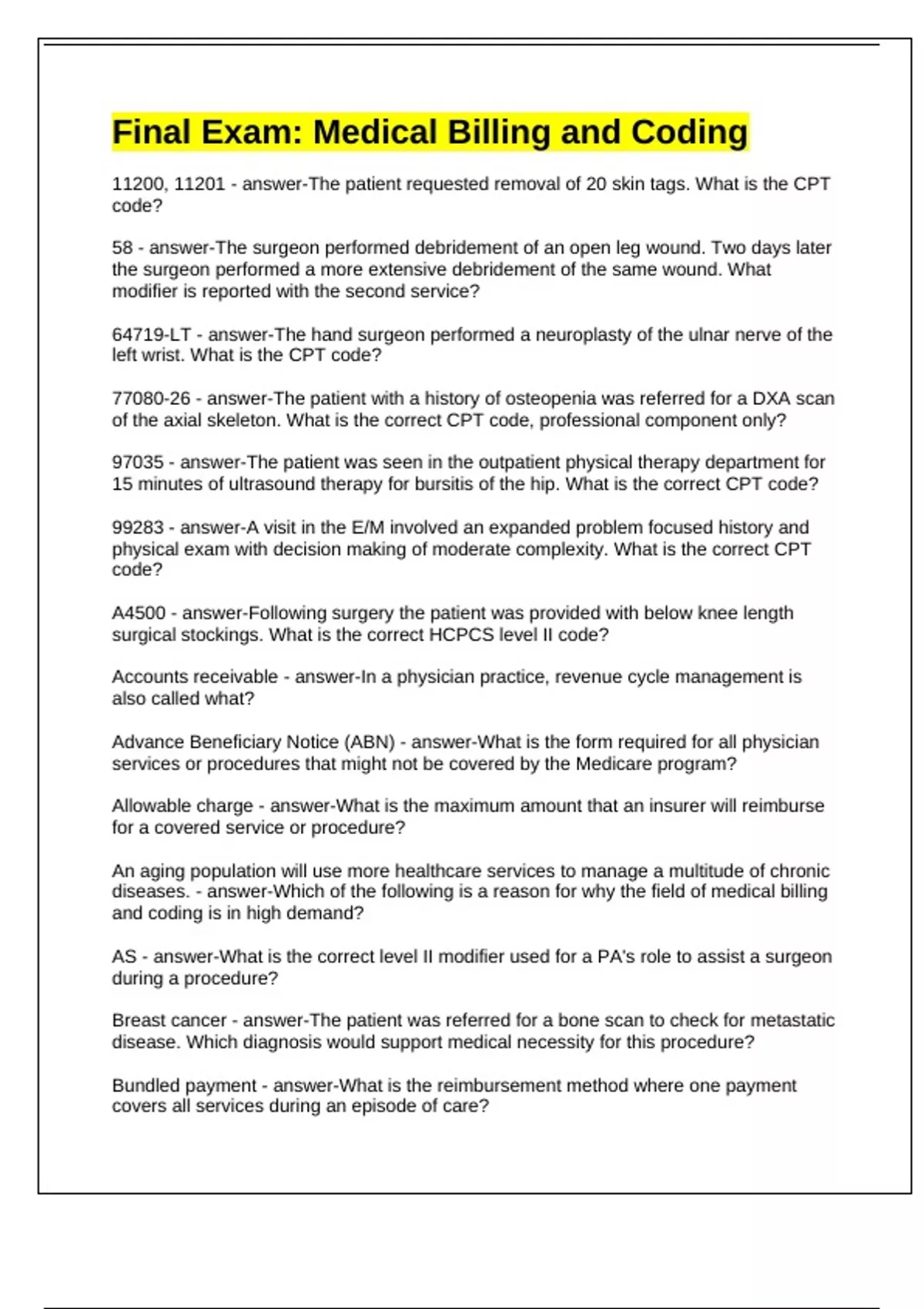 11200, 11201 - answer-The patient requested removal of 20 skin tags. What is the CPT code? 58 - answer-The surgeon performed debridement of an open leg wound. Two days later the surgeon performed a more extensive debridement of the same wound. What modifier is reported with the second service? 64719-LT - answer-The hand surgeon performed a neuroplasty of the ulnar nerve of the left wrist. What is the CPT code? 77080-26 - answer-The patient with a history of osteopenia was referred for a DXA scan of the axial skeleton. What is the correct CPT code, professional component only? 97035 - answer-The patient was seen in the outpatient physical therapy department for 15 minutes of ultrasound therapy for bursitis of the hip. What is the correct CPT code? 99283 - answer-A visit in the E/M involved an expanded problem focused history and physical exam with decision making of moderate complexity. What is the correct CPT code? A4500 - answer-Following surgery the patient was provided with below knee length surgical stockings. What is the correct HCPCS level II code? Accounts receivable - answer-In a physician practice, revenue cycle management is also called what? Advance Beneficiary Notice (ABN) - answer-What is the form required for all physician services or procedures that might not be covered by the Medicare program? Allowable charge - answer-What is the maximum amount that an insurer will reimburse for a covered service or procedure? An aging population will use more healthcare services to manage a multitude of chronic diseases. - answer-Which of the following is a reason for why the field of medical billing and coding is in high demand? AS - answer-What is the correct level II modifier used for a PA's role to assist a surgeon during a procedure? Breast cancer - answer-The patient was referred for a bone scan to check for metastatic disease. Which diagnosis would support medical necessity for this procedure? Bundled payment - answer-What is the reimbursement method where one payment cover