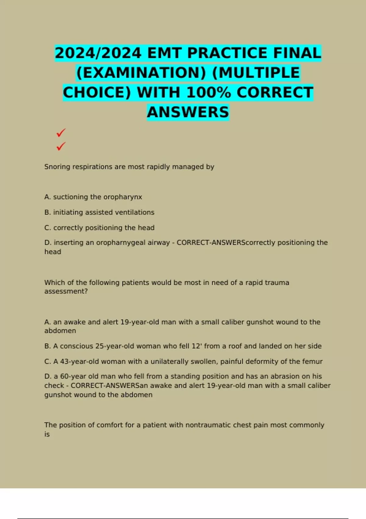 2024/2024 EMT PRACTICE FINAL (EXAMINATION) (MULTIPLE CHOICE) WITH 100% CORRECT ANSWERS