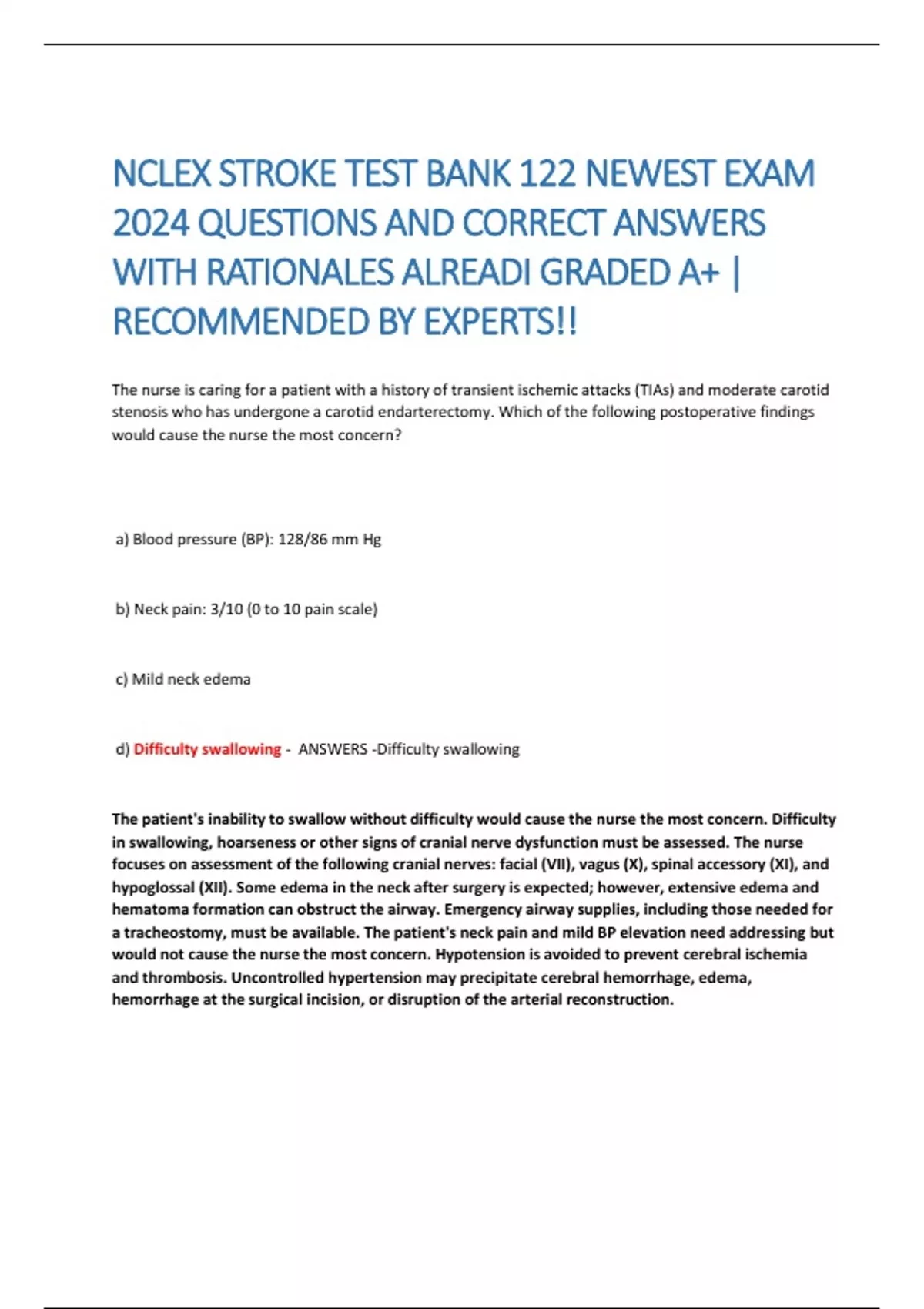 NCLEX STROKE TEST BANK 122 NEWEST EXAM 2024 QUESTIONS AND CORRECT ANSWERS WITH RATIONALES ALREADI GRADED A+ | RECOMMENDED BY EXPERTS!!
