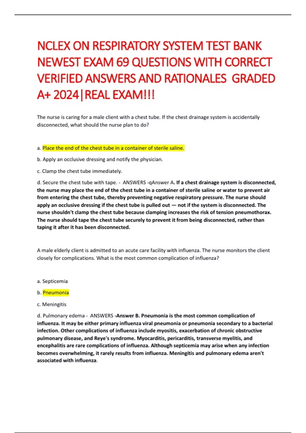 NCLEX ON RESPIRATORY SYSTEM TEST BANK NEWEST EXAM 69 QUESTIONS WITH CORRECT VERIFIED ANSWERS AND RATIONALES GRADED A+ 2024|REAL EXAM!!! NCLEX ON RESPIRATORY SYSTEM TEST BANK NEWEST EXAM 69 QUESTIONS WITH CORRECT VERIFIED ANSWERS AND RATIONALES GRADED A+ 2024|REAL EXAM!!! NCLEX ON RESPIRATORY SYSTEM TEST BANK NEWEST EXAM 69 QUESTIONS WITH CORRECT VERIFIED ANSWERS AND RATIONALES GRADED A+ 2024|REAL EXAM!!! NCLEX ON RESPIRATORY SYSTEM TEST BANK NEWEST EXAM 69 QUESTIONS WITH CORRECT VERIFIED ANSWERS AND RATIONALES GRADED A+ 2024|REAL EXAM!!! NCLEX ON RESPIRATORY SYSTEM TEST BANK NEWEST EXAM 69 QUESTIONS WITH CORRECT VERIFIED ANSWERS AND RATIONALES GRADED A+ 2024|REAL EXAM!!! NCLEX ON RESPIRATORY SYSTEM TEST BANK NEWEST EXAM 69 QUESTIONS WITH CORRECT VERIFIED ANSWERS AND RATIONALES GRADED A+ 2024|REAL EXAM!!!