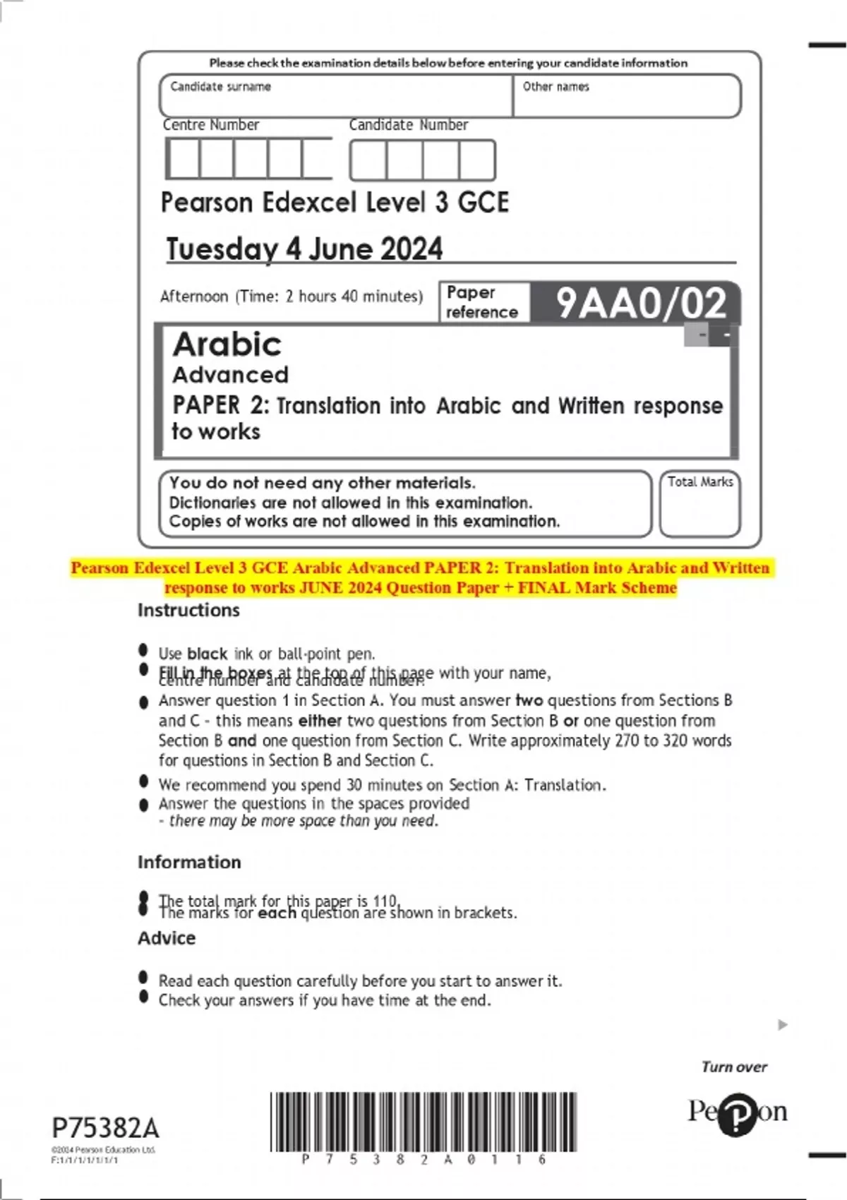 Pearson Edexcel Level 3 GCE Arabic Advanced PAPER 2: Translation into Arabic and Written response to works JUNE 2024 Question Paper + FINAL Mark Scheme