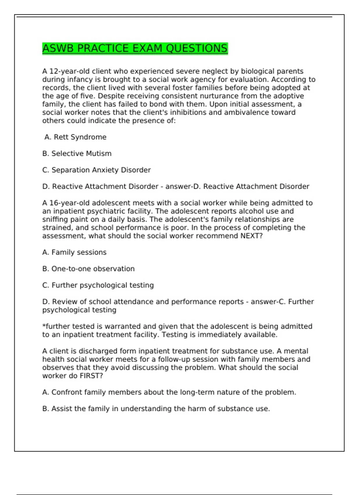 A 12-year-old client who experienced severe neglect by biological parents during infancy is brought to a social work agency for evaluation. According to records, the client lived with several foster families before being adopted at the age of five. Despite receiving consistent nurturance from the adoptive family, the client has failed to bond with them. Upon initial assessment, a social worker notes that the client's inhibitions and ambivalence toward others could indicate the presence of: A. Rett Syndrome B. Selective Mutism C. Separation Anxiety Disorder D. Reactive Attachment Disorder - answer-D. Reactive Attachment Disorder A 16-year-old adolescent meets with a social worker while being admitted to an inpatient psychiatric facility. The adolescent reports alcohol use and sniffing paint on a daily basis. The adolescent's family relationships are strained, and school performance is poor. In the process of completing the assessment, what should the social worker recommend NEXT? A. Family sessions B. One-to-one observation C. Further psychological testing D. Review of school attendance and performance reports - answer-C. Further psychological testing *further tested is warranted and given that the adolescent is being admitted to an inpatient treatment facility. Testing is immediately available. A client is discharged form inpatient treatment for substance use. A mental health social worker meets for a follow-up session with family members and observes that they avoid discussing the problem. What should the social worker do FIRST? A. Confront family members about the long-term nature of the problem. B. Assist the family in understanding the harm of substance use. C. Determine the extent of denial within the family system. D. Advise the family members that relapse is a realistic possibility. - answer-C. Determine the extent of denial within the family system. *The social worker should FIRST follow up on the observation that the family is using denial as a coping strategy. This must occur before intervention can take place. A client meets with a social worker to discuss parenting a rebellious ado