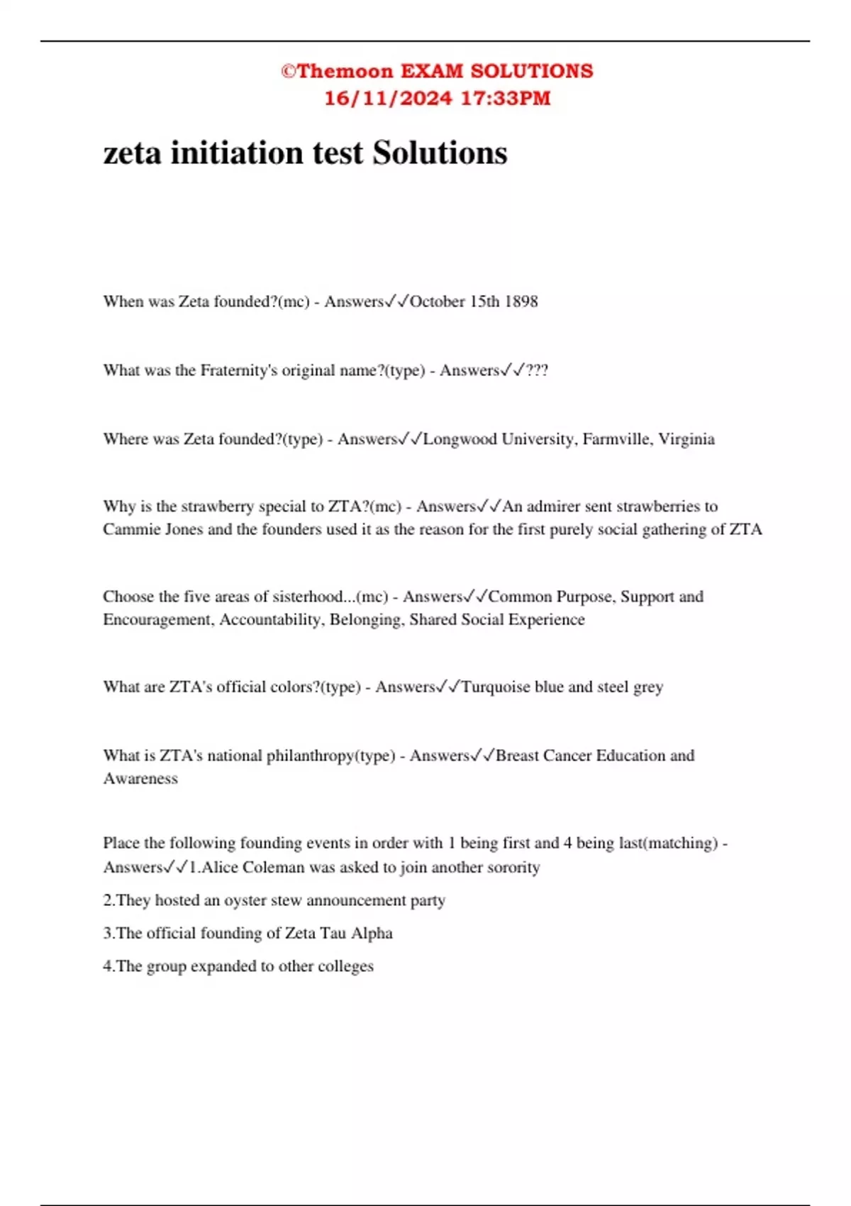 zeta initiation test Solutions When was Zeta founded?(mc) - AnswersOctober 15th 1898 What was the Fraternity's original name?(type) - Answers??? Where was Zeta founded?(type) - AnswersLongwood University, Farmville, Virginia Why is the strawberry special to ZTA?(mc) - AnswersAn admirer sent strawberries to Cammie Jones and the founders used it as the reason for the first purely social gathering of ZTA Choose the five areas of sisterhood...(mc) - AnswersCommon Purpose, Support and Encouragement, Accountability, Belonging, Shared Social Experience What are ZTA's official colors?(type) - AnswersTurquoise blue and steel grey What is ZTA's national philanthropy(type) - AnswersBreast Cancer Education and Awareness Place the following founding events in order with 1 being first and 4 being last(matching) - Answers1.Alice Coleman was asked to join another sorority 2.They hosted an oyster stew announcement party 3.The official founding of Zeta Tau Alpha 4.The group expanded to other colleges