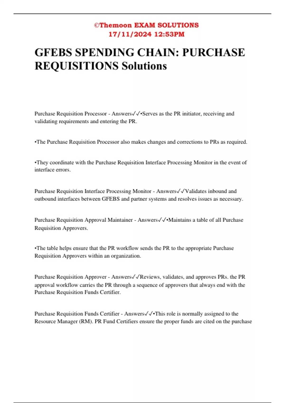 GFEBS SPENDING CHAIN: PURCHASE REQUISITIONS Solutions Purchase Requisition Processor - Answers•Serves as the PR initiator, receiving and validating requirements and entering the PR. •The Purchase Requisition Processor also makes changes and corrections to PRs as required. •They coordinate with the Purchase Requisition Interface Processing Monitor in the event of interface errors. Purchase Requisition Interface Processing Monitor - AnswersValidates inbound and outbound interfaces between GFEBS and partner systems and resolves issues as necessary. Purchase Requisition Approval Maintainer - Answers•Maintains a table of all Purchase Requisition Approvers. •The table helps ensure that the PR workflow sends the PR to the appropriate Purchase Requisition Approvers within an organization. Purchase Requisition Approver - AnswersReviews, validates, and approves PRs. the PR approval workflow carries the PR through a sequence of approvers that always end with the Purchase Requisition Funds Certifier. Purchase Requisition Funds Certifier - Answers•This role is normally assigned to the Resource Manager (RM). PR Fund Certifiers ensure the proper funds are cited on the purchase requisition. Fund Certification is always the last step in the approval process and results in a commitment of funds. •Carries the PR through a sequence of approvers that always end with the Purchase Requisition Funds Certifier. Contract Number - Answers(provide an example of the contract number W91YTZ-12-C-0001) Contract number only required on PRs interfacing to contracting. This must be in the header text and will better assist contracting when awarding option years on a contract. Purchase Group - AnswersLast 3 digits of the Contracting Offices DoDAAC i.e. W91QV1. The purchase group determines the contracting agency to which the PR is routed to for award. This is a mandatory field which will be used on all PR types. The purpose of the purchase group on a outbound MIPR is different and will be covered in the approval section of this lesson. Desired Vendor - AnswersCage Code for PRs going to contracting. If it is a new requirement the cage code can be left blank.