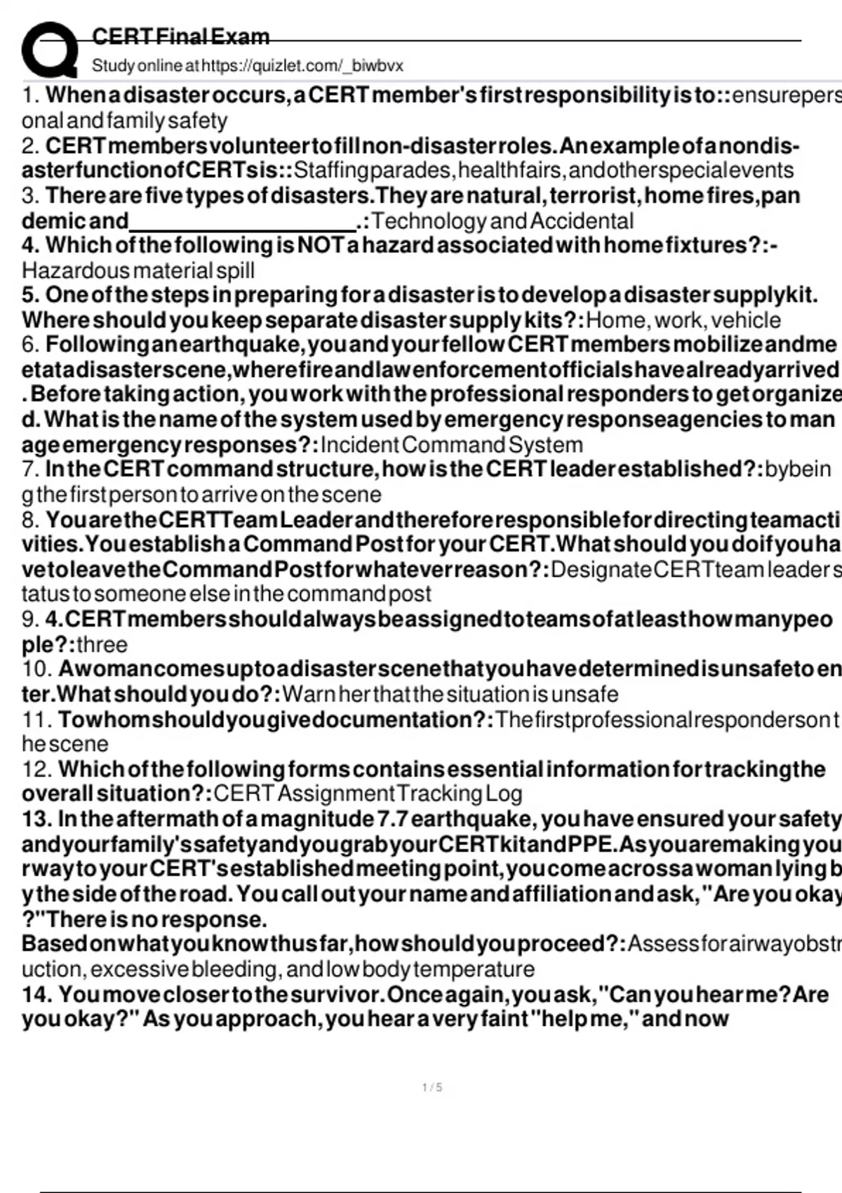 1. When a disaster occurs, a CERT member's first responsibility is to:: ensurepers