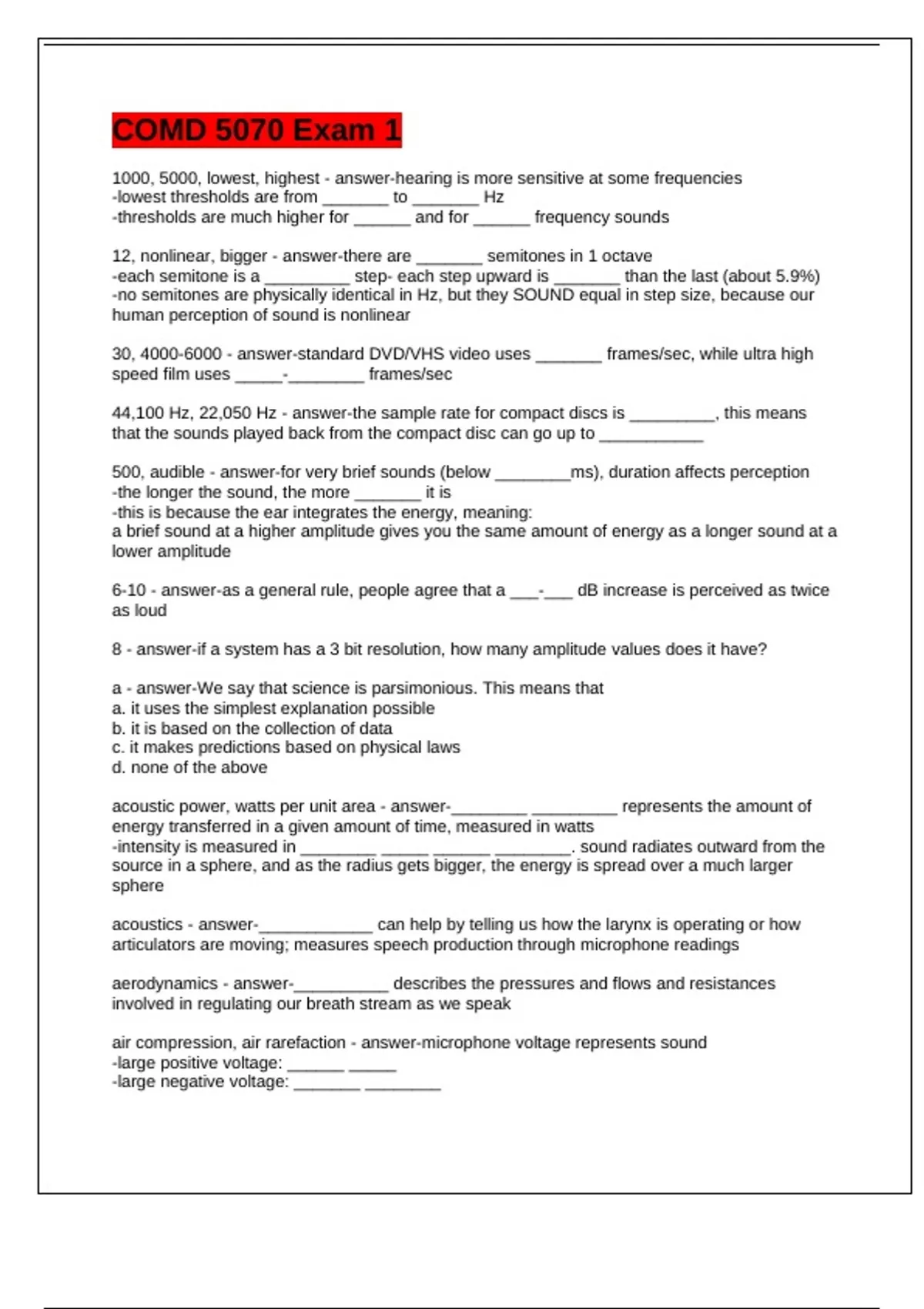 1000, 5000, lowest, highest - answer-hearing is more sensitive at some frequencies -lowest thresholds are from _______ to _______ Hz -thresholds are much higher for ______ and for ______ frequency sounds 12, nonlinear, bigger - answer-there are _______ semitones in 1 octave -each semitone is a _________ step- each step upward is _______ than the last (about 5.9%) -no semitones are physically identical in Hz, but they SOUND equal in step size, because our human perception of sound is nonlinear 30, - answer-standard DVD/VHS video uses _______ frames/sec, while ultra high speed film uses _____-________ frames/sec 44,100 Hz, 22,050 Hz - answer-the sample rate for compact discs is _________, this means that the sounds played back from the compact disc can go up to ___________ 500, audible - answer-for very brief sounds (below ________ms), duration affects perception -the longer the sound, the more _______ it is -this is because the ear integrates the energy, meaning: a brief sound at a higher amplitude gives you the same amount of energy as a longer sound at a lower amplitude 6-10 - answer-as a general rule, people agree that a ___-___ dB increase is perceived as twice as loud 8 - answer-if a system has a 3 bit resolution, how many amplitude values does it have? a - answer-We say that science is parsimonious. This means that a. it uses the simplest explanation possible b. it is based on the collection of data c. it makes predictions based on physical laws d. none of the above acoustic power, watts per unit area - answer-________ _________ represents the amount of energy transferred in a given amount of time, measured in watts -intensity is measured in ________ _____ ______ ________. sound radiates outward from the source in a sphere, and as the radius gets bigger, the energy is spread over a much larger sphere acoustics - answer-____________ can help by telling us how the larynx is operating or how articulators are moving; measures speech production through microphone readings aerodynamics - answer-__________ describes the pressures and flows and resistances involved in regulating our breath stream as we speak air compression, air rarefaction - answer-microphone voltage represents sound -large positive voltage: ______ _____ -large negative voltage: _______ ________ all frequencies, equal amplitudes, random phase - answer-what does noise look like on a spectrum? (3) anti-aliasing - answer-_______ _________: filtering before digitizing which prevents aliasing -set filter to nyquist frequency and any frequencies above it are deleted and cannot contaminate the recording i.e. using a low pass filter to prevent the higher frequencies from even reaching the digitized system so that they won't contaminate the lower frequency recording by being represented as an alias b - answer-a spectrum differs from a spectrogram because: a. it is a time domain display b. it does not represent time on its axis b - answer-An electroglottograph reveals details of voicing by a. passing a strong light through the glottis b. passing a current across the vocal folds c. passing a flexible scope through the nasal cavity d. passing air through the nares b - answer-the relationship between perturbation and modulation is: a. they are mutually exclusive b. it is possible for both to occur in the same voice b - answer-When a signal is converted from analog to digital form, the number of 'snapshots' per second is the a. quantization accuracy b. sampling rate c. Nyquist frequency d. digitization coefficient band pass - answer-a _______ _________ filter allows a band of frequencies in the middle through, and holds back both higher and lower frequencies band reject - answer-a _________ ________ filter holds back a band of frequencies in the middle and allows both higher and lower frequencies through brown - answer-________ noise falls of at about 6 dB per octave c - answer-A low pass filter a. removes low frequencies b. has no effect on a speech recording c. blocks high frequencies d. amplifies vowels e. none of the above c - answer-A single vertical line on a line spectrum would represent: a. a vowel sound b. white noise c. a sine wave d. a harmonic series e. a high pass filter c - answer-Loudness is best measured by a. calculating the root mean square of a signal b. using a sound level meter c. having a listener make a perceptual judgment d. averaging the mean peak waveform height c - answer-The best way to avoid aliasing during a digital recording is to use a a. band reject filter b. high pass filter c. low pass filter d. band pass filter complex tone - answer-a _________ ________ involves multiple sine waves together, blended, with the fundamental frequency as the lowest frequency component