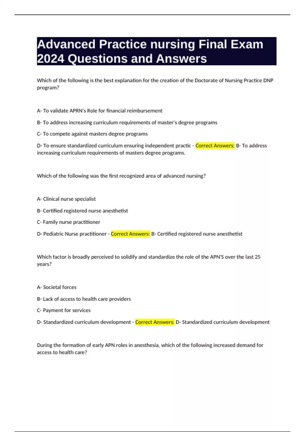 Advanced Practice nursing Final Exam 2024 Questions and Answers.