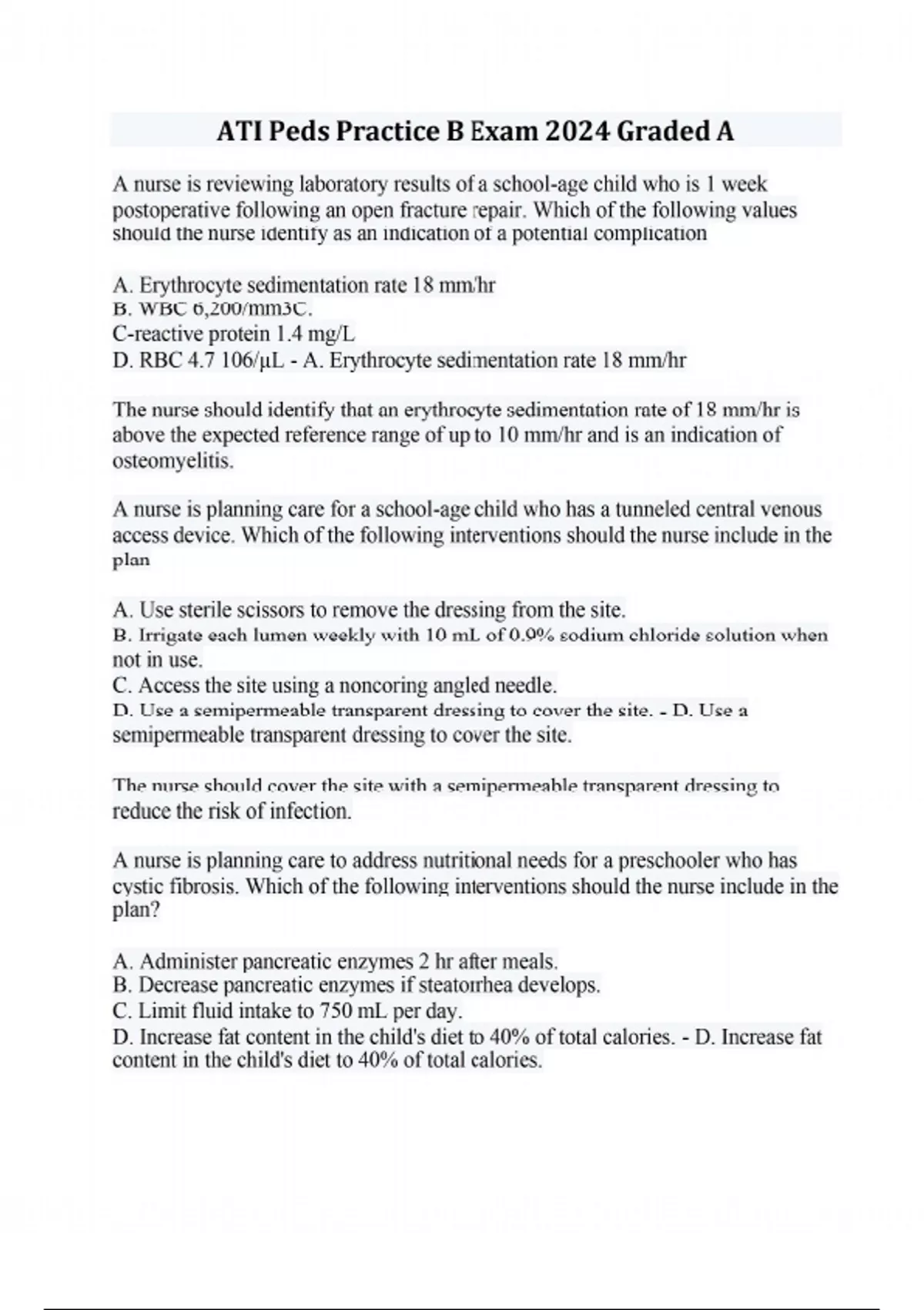 A nurse is reviewing laboratory results of a school-age child who is 1 week postoperative following an open fracture repair. Which of the following values should the nurse identify as an indication of a potential complication A. Erythrocyte sedimentation rate 18 mm/hr B. WBC 6,200/mm3C. C-reactive protein 1.4 mg/L D. RBC 4.7 106/μL - A. Erythrocyte sedimentation rate 18 mm/hr The nurse should identify that an erythrocyte sedimentation rate of 18 mm/hr is above the expected reference range of up to 10 mm/hr and is an indication of osteomyelitis. A nurse is planning care for a school-age child who has a tunneled central venous access device. Which of the following interventions should the nurse include in the plan A. Use sterile scissors to remove the dressing from the site. B. Irrigate each lumen weekly with 10 mL of 0.9% sodium chloride solution when not in use. C. Access the site using a noncoring angled needle. D. Use a semipermeable transparent dressing to cover the site. - D. Use a semipermeable transparent dressing to cover the site. The nurse should cover the site with a semipermeable transparent dressing to reduce the risk of infection. A nurse is planning care to address nutritional needs for a preschooler who has cystic fibrosis. Which of the following interventions should the nurse include in the plan? A. Administer pancreatic enzymes 2 hr after meals. B. Decrease pancreatic enzymes if steatorrhea develops. C. Limit fluid intake to 750 mL per day. D. Increase fat content in the child's diet to 40% of total calories. - D. Increase fat content in the child's diet to 40% of total calories. A child who has cystic fibrosis is unable to properly digest fats due to fibrosis of the pancreas and limited secretion of pancreatic enzymes. The nurse should increase the child's fat intake to 35% to 40% of total caloric intake. A nurse in an emergency department is auscultating the lungs of an adolescent who is experiencing dyspnea. The nurse should identify the sound as which of the following? A. Wheezes B. Crackles C. Pleural friction rub D. Rhonchi - A. Wheezes The nurse should identify the sound during auscultation as wheezes, which are high-pitched, musical or whistling-like sounds heard primarily on expiration as air passes through and vibrates narrowed airways. A nurse is assessing a school-age child who has an infratentorial brain tumor. Which of the following findings should the nurse identify as a manifestation of increased intracranial pressure? A. Hypotension B. Reports insomnia C. Difficulty concentrating D. Tachycardia - C. Difficulty concentrating The nurse should identify that irritability, inability to follow commands, and difficulty concentrating are manifestations of increased intracranial pressure due to decreased blood flow within the brain and pressure on the brainstem. A nurse is assessing an infant who has pneumonia. Which of the following findings is the priority for the nurse to report the provider? A. Nasal flaring B. WBC count 11,300/mm3 C. Diarrhea D. Abdominal distension - A. Nasal flaring When using the airway, breathing, and circulation approach to client care, the nurse should determine that the priority finding to report to the provider is nasal flaring. Nasal flaring indicates the infant is experiencing acute respiratory distress. A nurse in a health department is caring for an emancipated adolescent who has an STI and is unaccompanied by a guardian. Which of the following actions should the nurse take? A. Have the adolescent sign a consent form for treatment. B. Instruct the adolescent to return with a guardian. C. Obtain consent from the adolescent's guardian over the phone. D. Treat the adolescent without a consent form. - A. Have the adolescent sign a consent form for treatment. The nurse should identify that an emancipated minor can sign the consent form for treatment of an STI or any other form of medical treatment requiring consent. A nurse is providing teaching to an adolescent about how to manage tinea pedis. Which of the following statements by the adolescent indicates an understanding of the teaching? A. "I should buy plastic shoes to wear at the swimming pool." B. "I should wear sandals as much as possible." C. "I should place the permethrin cream between my toes twice daily." D. "I should seal my nonwashable shoes in plastic bags for a couple of weeks." - B. "I should wear sandals as much as possible." Sandals allow air to circulate around the feet, decreasing perspiration and eliminating the medium for bacteria and fungus to grow. The nurse should inform the adolescent that wearing sandals, open-toed, or well-ventilated shoes will promote healing of the fungal infection. A nurse is assessing an 8 year old child who has early indication of shock. After establishing an airway and stabilizing the child's respirations, which of the following actions should the nurse take next? A. Insert an indwelling urinary catheter. B. Measure weight and height. C. Initiate IV access. D. Maintain ECG monitoring. - C. Initiate IV access. After establishing an airway and stabilizing the child's respirations, the next action the nurse should take when using the airway, breathing, and circulation approach to client care is to establish IV access to maintain the child's circulatory volume. A charge nurse is preparing to make a room assignment for a newly admitted school age child. Which of the following considerations is the nurse's priority? A. Length of stay B. Treatment schedule C. Disease process D. Self-care ability - C. Disease process The transmission of infectious diseases is the greatest risk to this child and other children on the unit. Therefore, the child's disease process is the nurse's priority consideration. A nurse in an emergency department is assessing a 3 month old infant who has rotavirus and is experiencing acute vomiting and diarrhea. Which of the following manifestations should the nurse identify as an indication that the infant has moderate to