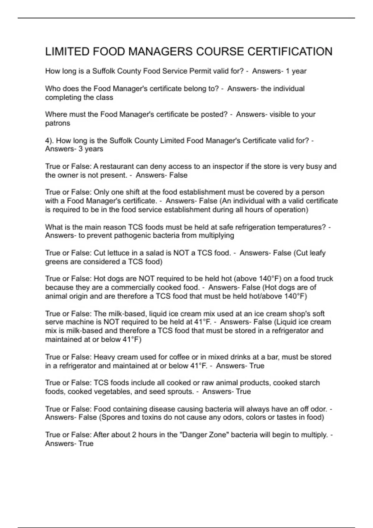 LIMITED FOOD MANAGERS COURSE CERTIFICATION