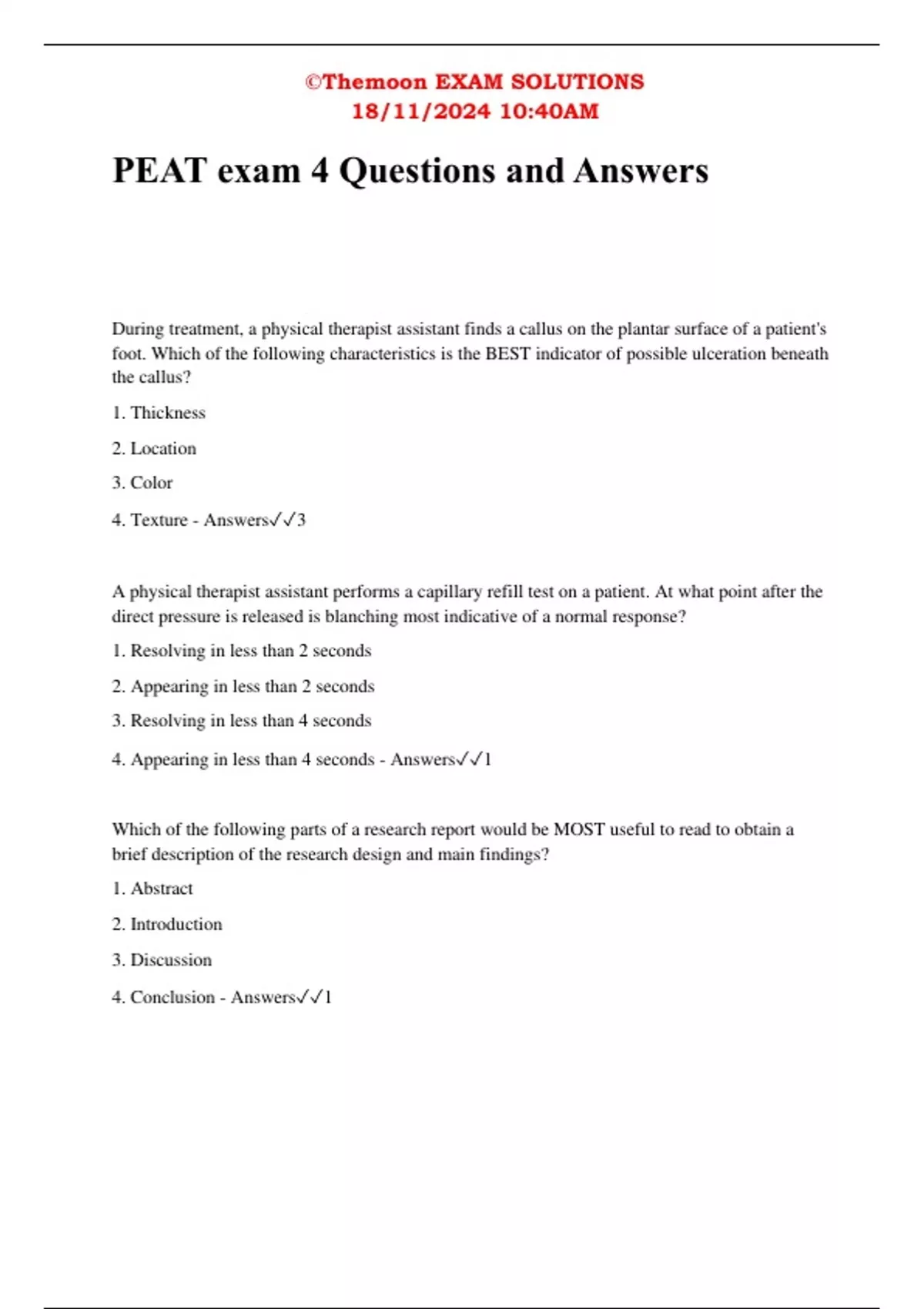 PEAT exam 4 Questions and Answers During treatment, a physical therapist assistant finds a callus on the plantar surface of a patient's foot. Which of the following characteristics is the BEST indicator of possible ulceration beneath the callus? 1. Thickness 2. Location 3. Color 4. Texture - Answers3 A physical therapist assistant performs a capillary refill test on a patient. At what point after the direct pressure is released is blanching most indicative of a normal response? 1. Resolving in less than 2 seconds 2. Appearing in less than 2 seconds 3. Resolving in less than 4 seconds 4. Appearing in less than 4 seconds - Answers1 Which of the following parts of a research report would be MOST useful to read to obtain a brief description of the research design and main findings? 1. Abstract 2. Introduction 3. Discussion 4. Conclusion - Answers1 A patient who is postmenopausal reports dull thoracic pain and increased rounding of shoulders. Radiographs indicate wedging of the T11 vertebra due to an old, undiagnosed fracture. Which of the following exercise interventions should be emphasized? 1. Thoracic extension exercises 2. Concentric abdominal exercises 3. Participation in a water aerobics program 4. Resisted lower extremity exercises - Answers1 A patient exhibits limited hip flexion and reports unilateral hip pain and stiffness that are relieved by rest. Which of the following conditions is the MOST likely cause of these symptoms? 1. Parkinson disease 2. Rheumatoid arthritis 3. Osteoarthritis 4. Multiple sclerosis - Answers3 A patient has pain in multiple joints, fever, and reddish patches on the cheeks and nose. Which of the following conditions is the MOST likely cause of these symptoms? 1. Rheumatoid arthritis 2. Fibromyalgia syndrome 3. Polymyalgia rheumatica 4. Systemic lupus erythematosus - Answers4 A patient will have difficulty performing forced expiration if there is severe weakness of which of the following muscles? 1. Transversus abdominis 2. Diaphragm 3. Pectoralis major 4. Scalenus anterior - Answers1 Which of the following dressings is MOST appropriate for an infected Stage 3 pressure injury with copious amounts of exudate? 1. Hydrocolloid 2. Hydrogel 3. Semipermeable film 4. Alginate - Answers4 A patient who has type 2 diabetes is undergoing a stress test on a treadmill but is having difficulty with foot placement as the speed of gait increases. Which of the following conditions is MOST likely contributing to this difficulty? 1. Weak hip flexors 2. Cataracts 3. Atherosclerosis 4. Peripheral neuropathy - Answers4 While treating an 83-year-old patient, a physical therapist assistant observes bruising consistent with abuse. The assistant is legally obligated to take which of the following actions? 1. Discuss the findings with an attorney. 2. Report the findings to the appropriate authorities. 3. Discuss the findings with the family. 4. Maintain confidentiality by not reporting to anyone. - Answers2 The assessment of a patient's learning style reveals that the patient would benefit from decreasing the cognitive demands of a task when learning a motor task. Which of the following practice schedules is MOST likely to be effective for the patient? 1. Random 2. Blocked 3. Massed 4. Distributed - Answers2 Which of the following conditions is MOST commonly observed in a child who has myelomeningocele at the L5 spinal level? 1. Knee valgus 2. Hyperlordosis 3. Hip dislocation 4. Hindfoot deformity - Answers4 A patient who has been restricted to total bed rest for 1 week should be expected to exhibit which of the following changes in cardiopulmonary function? 1. Increased resting heart rate 2. Decreased submaximal exercise heart rate 3. Increased functional residual capacity 4. Decreased respiratory rate - Answers1 In a patient who hyperventilates, which of the following changes in blood gas values is likely to have the GREATEST magnitude? 1. Decrease in partial pressure of arterial carbon dioxide (PaCO2) 2. Increase in partial pressure of arterial carbon dioxide (PaCO2) 3. Decrease in partial pressure of arterial oxygen (PaO2) 4. Increase in partial pressure of arterial oxygen (PaO2) - Answers1 A patient's knee was immobilized for 6 weeks. Which of the following structural changes has MOST likely occurred in the collagen fibers of the patellar tendon? 1. Haphazard alignment with low tensile strength 2. Haphazard alignment with high tensile strength 3. Parallel alignment with low tensile strength 4. Parallel alignment with high tensile strength - Answers1 While pulling to the standing position and cruising, a 1-year-old child flexes the toes bilaterally. Which of the following observations would be of MOST concern? 1. The plantar reflex has not been integrated. 2. The positive supporting reflex has not been integrated. 3. The Babinski reflex is interfering with the infant's functioning. 4. The spontaneous stepping reflex is interfering with the infant's functioning. - Answers1 Which of the following modes of aerobic exercise would be BEST for a patient who has coronary artery disease and lumbar stenosis? 1. Aquatic therapy 2. Walking on a treadmill 3. Use of an elliptical machine 4. Use of a recumbent bicycle - Answers4