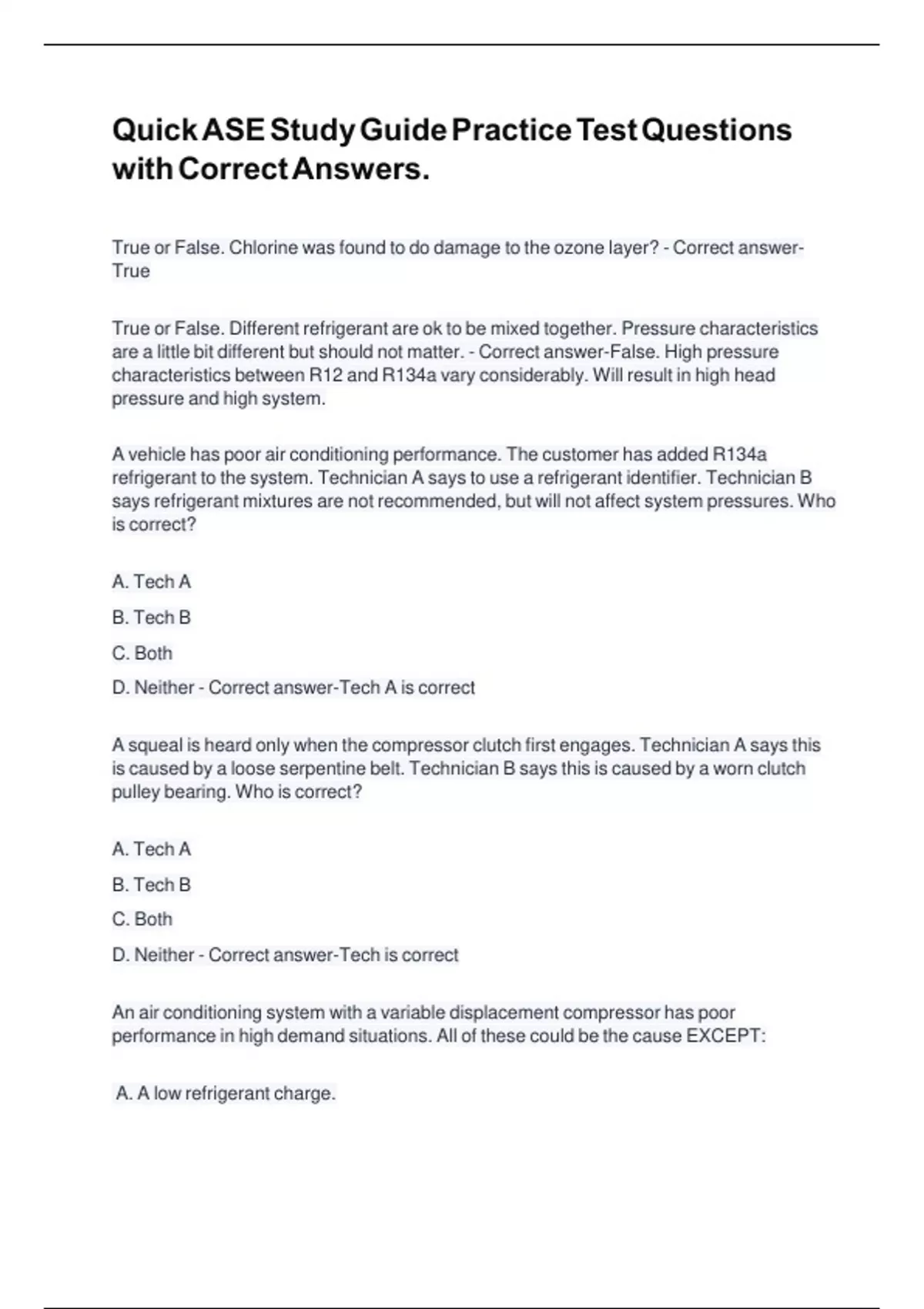 Quick ASE Study Guide Practice Test Questions with Correct Answers. True or False. Chlorine was found to do damage to the ozone layer? - Correct answer-True True or False. Different refrigerant are ok to be mixed together. Pressure characteristics are a little bit different but should not matter. - Correct answer-False. High pressure characteristics between R12 and R134a vary considerably. Will result in high head pressure and high system. A vehicle has poor air conditioning performance. The customer has added R134a refrigerant to the system. Technician A says to use a refrigerant identifier. Technician B says refrigerant mixtures are not recommended, but will not affect system pressures. Who is correct? A. Tech A B. Tech B C. Both D. Neither - Correct answer-Tech A is correct A squeal is heard only when the compressor clutch first engages. Technician A says this is caused by a loose serpentine belt. Technician B