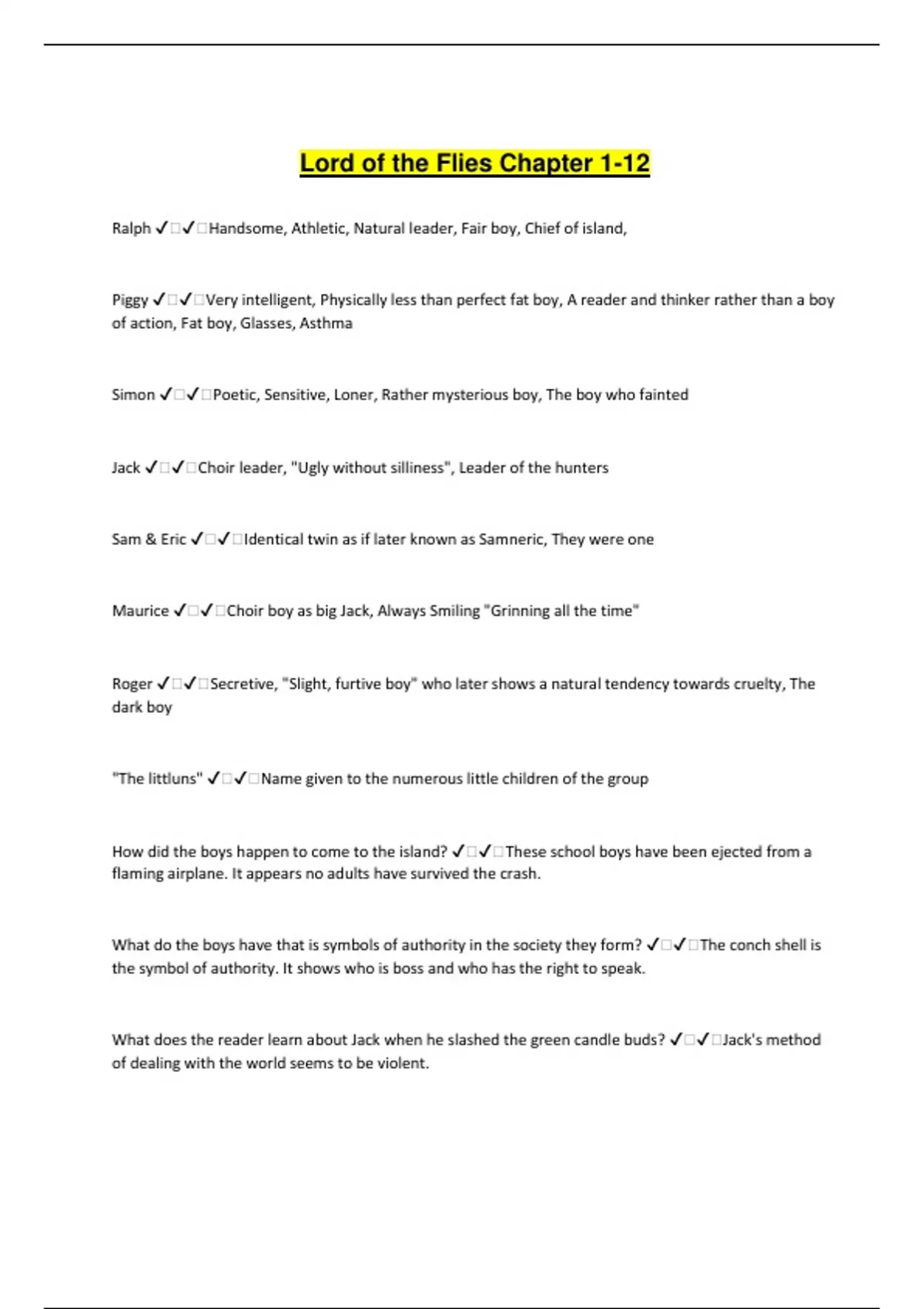 Lord of the Flies Chapter 1-12 Ralph ️️Handsome, Athletic, Natural leader, Fair boy, Chief of island, Piggy ️️Very intelligent, Physically less than perfect fat boy, A reader and thinker rather than a boy of action, Fat boy, Glasses, Asthma Simon ️️Poetic, Sensitive, Loner, Rather mysterious boy, The boy who fainted Jack ️️Choir leader, "Ugly without silliness", Leader of the hunters Sam & Eric ️️Identical twin as if later known as Samneric, They were one Maurice ️️Choir boy as big Jack, Always Smiling "Grinning all the time" Roger ️️Secretive, "Slight, furtive boy" who later shows a natural tendency towards cruelty, The dark boy "The littluns" ️️Name given to the numerous little children of the group How did the boys happen to come to the island? ️️These school boys have been ejected from a flaming airplane. It appears no adults have survived the crash. What do the boys have that is symbols of authority in the society they form? ️️The conch shell is the symbol of authority. It shows who is boss and who has the right to speak. What does the reader learn about Jack when he slashed the green candle buds? ️️Jack's method of dealing with the world seems to be violent. Why does Jack hesitate when he lifts his knife to kill the piglet, and what does he promise will happen next time he meets a pig? ️️It is hard for Jack to kill living things because he was showing his mercy. Jack did not kill the pig because he did not want to. But next time Jack will kill the pig and is going to show no mercy. Who are the hunters, and what is their job? ️️The choir boys have become hunters. Their job is to get food. What does a little 'um think he has seen in the forest? ️️He thinks he has seen a "Snake-thing" which he later calls "Bestie." How and why do the boys make fire? ️️The boys make a fire to act as a signal for their reuse. They use Piggy's glasses as burning glass to start the fire with the sun's rays. Why does the boys' plan for rescue fail? ️️The boys did not have a well-thought-out plan. They used too much wood for a small, controllable fire, and they never thought of a way to control the fire to keep it from getting out of hand. Most of their available fire wood was burned up, making keeping the fire going much more difficult. Although Ralph criticizes the boys for their lack of cooperation, does he bear some of the responsibility for the failures of the group to achieve its goals? Why or Why not? ️️Ralph is partially responsible for their failures. He wants the boys to work and help from a civilized society of the island, but he doesn't know how to motivate them to do so. How has Jack's personality developed during his stay on the island? ️️Jack has degenerated from a superficially civilized school boy to a near animal level. He learned to kill, yet he too is learning the vest difference between imagining himself a hunter and actually killing a living creature. Ralph says of Simon, "He's queer. He's funny." What kind of a boy is Simon? ️️Simon is one of Ralph's most loyal and helpful workers. Yet, when he has some free time, he goes of by himself to find a place to be quiet and to think. Society, like the boys, distrusts those who are loners. After Maurice and Roger destroy the littleuns' sand castles, Roger stalks the young boy names Henry. When he begins to throw stones, why does he just throw them near him instead of directly at him? ️️The old laws of church and school and family still hold him back. What causes the hunters, who had promised to keep the fire burning, to neglect it and allow it to go out? ️️They felt that killing the pig (short term goal of eating) was more important than keeping the fire going as a signal (long term goal to be saved). Savages can not deal with long-term goals. They only live in the present, for instant gratification of their immediate needs. Why does Jack paint his face? ️️Jack's paint his face with clay paint to camouflage himself and become an anonymous savage. How does the author show us that Ralph is finally beginning to face the realities of their existence? ️️Ralph is dirty, have tangle hair and the clothes are getting rip and uncomfortable. What are the rules that the boys made for living on the island? ️️1. You can not talk unless you have the Conch Shell. 2. You have to walk around with a buddy. 3. Keep the fire going. 4. Use the restroom by the rocks. 5. You must bring food to the fire. You can not bring the fire down. Compare Ralph's treatment of the littluns with Jacks. ️️Ralph is nice and he calms the litteuns down. Jack scare the littleuns. What is Simon saying when he thinks the "beast" may be inside they boys themselves? ️️Simon thinks it is the dark side of the human. What do Sam and Eric tell the boys they have seen? What is it really? ️️It is the died pilot. Why do Ralph and Jack decide to go find the beast? ️️Ralph and Jake decide to go find the beast to face their fears. When the boar comes bounding along the path, how does Ralph react? ️️Ralph reaction was that he throw his spear at him but the boar still come running after him. What happened when Ralph was demonstrating what he did to the Boar? ️️Ralph did a reenactment and got out of control and speared Robert ***********