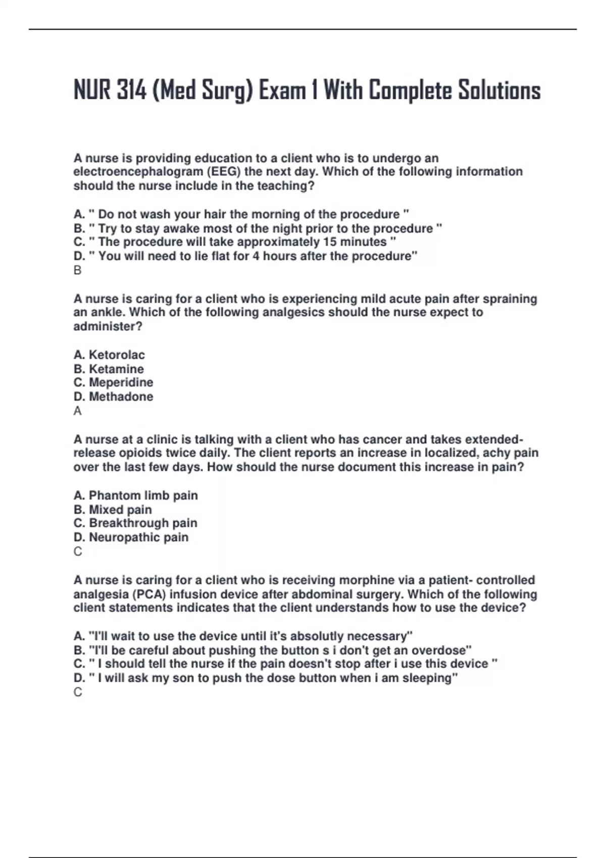 NUR 314 (Med Surg) Exam 1 With Complete Solutions A nurse is providing education to a client who is to undergo an electroencephalogram (EEG) the next day. Which of the following information should the nurse include in the teaching? A. " Do not wash your hair the morning of the procedure " B. " Try to stay awake most of the night prior to the procedure " C. " The procedure will take approximately 15 minutes " D. " You will need to lie flat for 4 hours after the procedure" B A nurse is caring for a client who is experiencing mild acute pain after spraining an ankle. Which of the following analgesics should the nurse expect to administer? A. Ketorolac B. Ketamine C. Meperidine D. Methadone A A nurse at a clinic is talking with a client who has cancer and takes extended- release opioids twice daily. The client reports an increase in localized, achy pain over the last few days. How should the nurse document this increase in pain? A. Phantom limb pain B. Mixed pain C. Breakthrough pain D. Neuropathic pain C A nurse is caring for a client who is receiving morphine via a patient- controlled analgesia (PCA) infusion device after abdominal surgery. Which of the following client statements indicates that the client understands how to use the device? A. "I'll wait to use the device until it's absolutly necessary" B. "I'll be careful about pushing the button s i don't get an overdose" C. " I should tell the nurse if the pain doesn't stop after i use this device " D. " I will ask my son to push the dose button when i am sleeping" C A nurse is discussing pain assessment with a newly licensed nurse. Which of the following information should the nurse include? A. Most clients exaggerate their level of pain B. Pain must have an identifiable source to justify the use of opioids C. Objective data are essential in assessing pain D. Pain is whatever the client says it is D