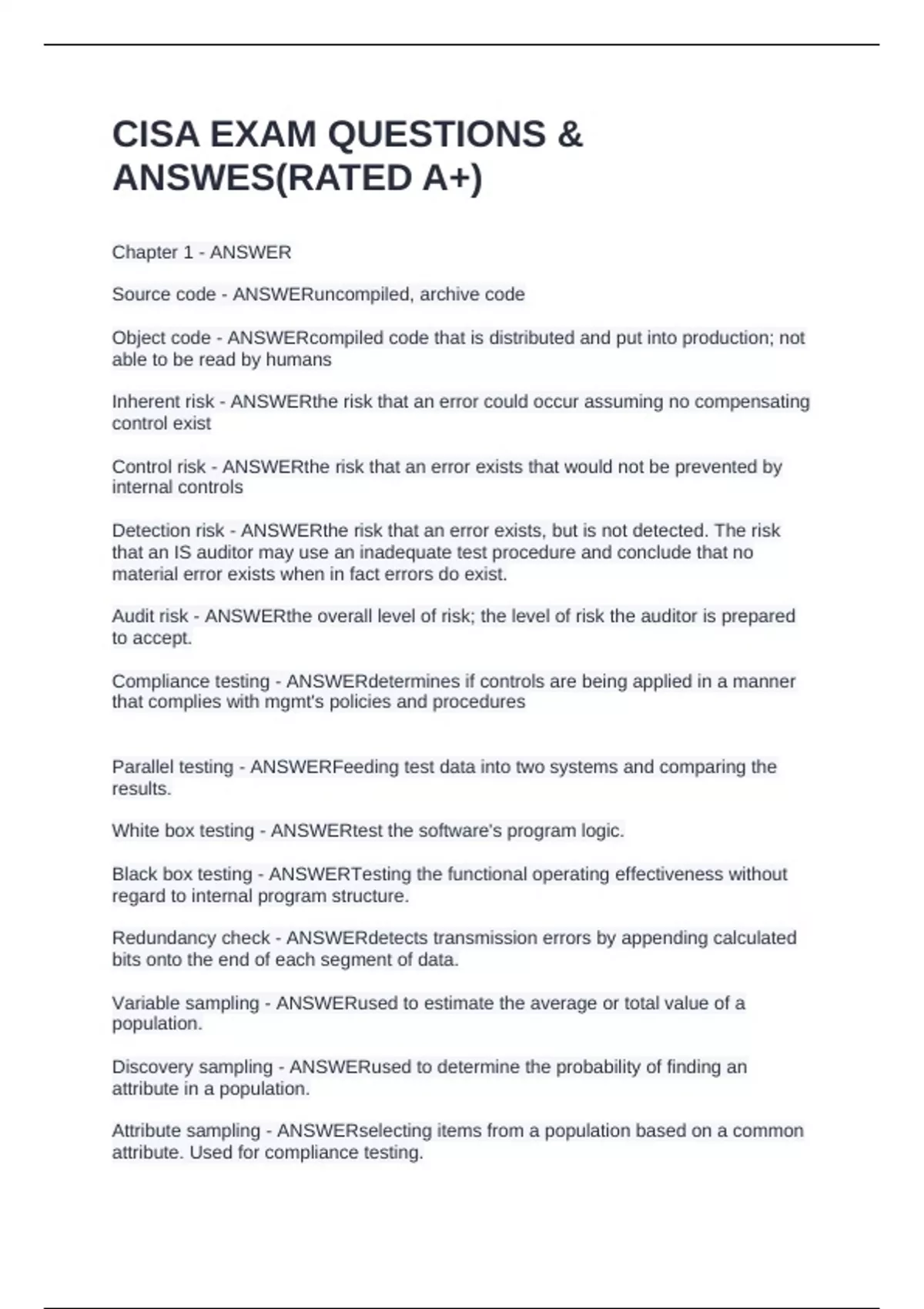 Chapter 1 - ANSWER Source code - ANSWERuncompiled, archive code Object code - ANSWERcompiled code that is distributed and put into production; not able to be read by humans Inherent risk - ANSWERthe risk that an error could occur assuming no compensating control exist Control risk - ANSWERthe risk that an error exists that would not be prevented by internal controls Detection risk - ANSWERthe risk that an error exists, but is not detected. The risk that an IS auditor may use an inadequate test procedure and conclude that no material error exists when in fact errors do exist. Audit risk - ANSWERthe overall level of risk; the level of risk the auditor is prepared to accept. Compliance testing - ANSWERdetermines if controls are being applied in a manner that complies with mgmt's policies and procedures Parallel testing - ANSWERFeeding test data into two systems and comparing the results. White box testing - ANSWERtest the software's program logic. Black box testing - ANSWERTesting the functional operating effectiveness without regard to internal program structure. Redundancy check - ANSWERdetects transmission errors by appending calculated bits onto the end of each segment of data. Variable sampling - ANSWERused to estimate the average or total value of a population. Discovery sampling - ANSWERused to determine the probability of finding an attribute in a population. Attribute sampling - ANSWERselecting items from a population based on a common attribute. Used for compliance testing. Chapter 2 - ANSWER Steering Committee - ANSWERAppointed by senior management. Serves as a general review board for projects and acquisitions... not involved in routine operations. The committee should include representatives from senior management, user management, and the IS department. Escalates issues to senior management. Substantive testing - ANSWERevaluates the integrity of individual transactions, data, and other information. Regression testing - ANSWERused to retest earlier program abends that occurred during the initial testing phase.