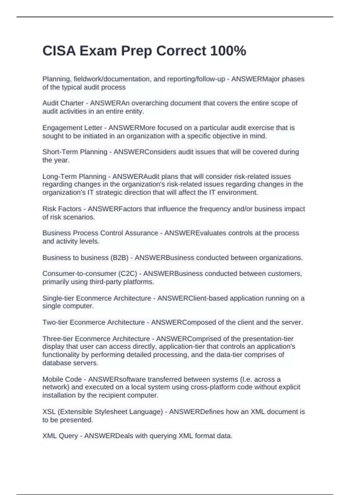 XSL (Extensible Stylesheet Language) - ANSWERDefines how an XML document is
