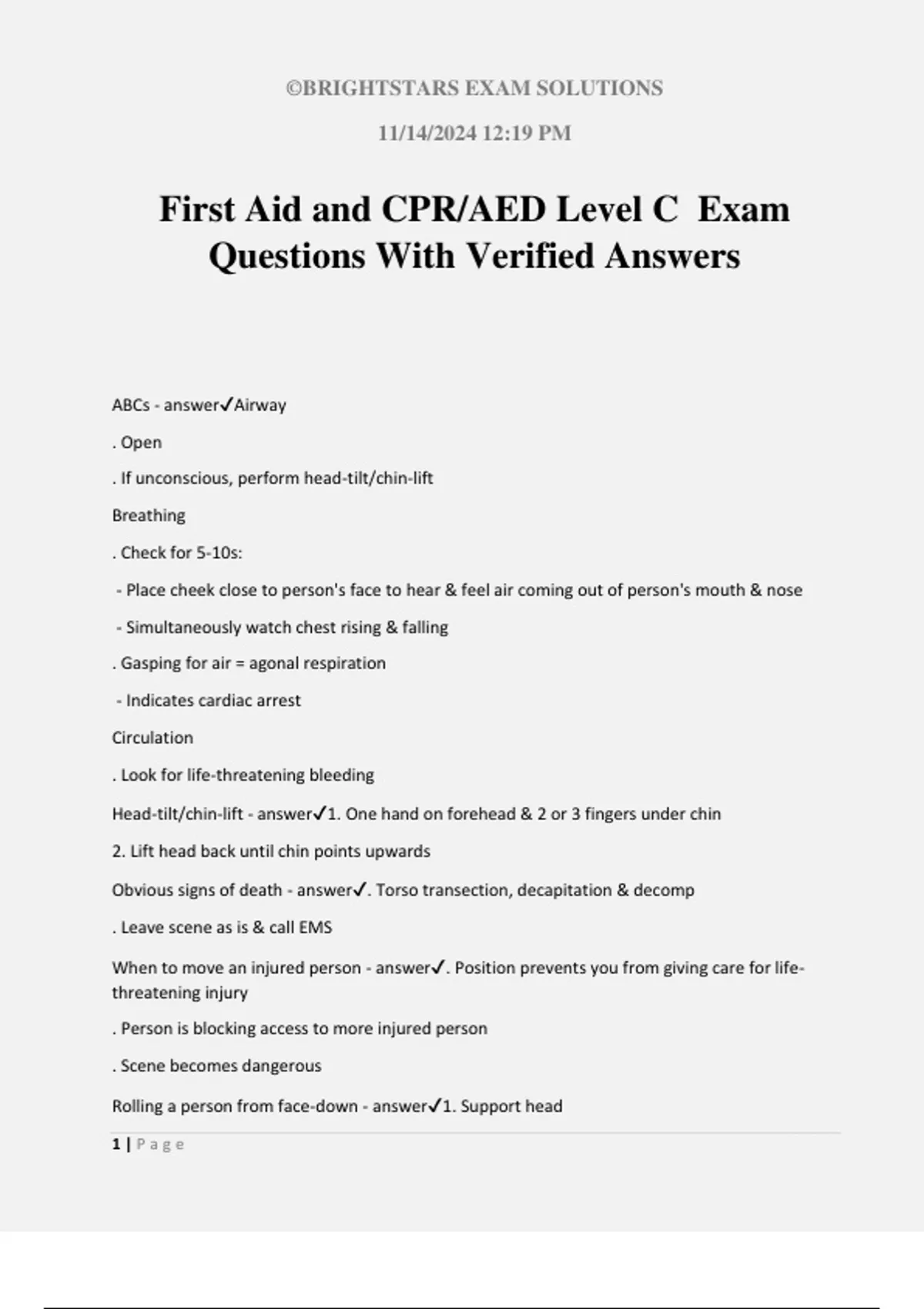 ©BRIGHTSTARS EXAM SOLUTIONS 11/14/2024 12:19 PM 1 | P a g e First Aid and CPR/AED Level C Exam Questions With Verified Answers ABCs - answerAirway . Open . If unconscious, perform head-tilt/chin-lift Breathing . Check for 5-10s: - Place cheek close to person's face to hear & feel air coming out of person's mouth & nose - Simultaneously watch chest rising & falling . Gasping for air = agonal respiration - Indicates cardiac arrest Circulation . Look for life-threatening bleeding Head-tilt/chin-lift - answer1. One hand on forehead & 2 or 3 fingers under chin 2. Lift head back until chin points upwards Obvious signs of death - answer. Torso transection, decapitation & decomp . Leave scene as is & call EMS When to move an injured person - answer. Position prevents you from giving care for life- threatening injury . Person is blocking access to more injured person . Scene becomes dangerous Rolling a person from face-down - answer1. Support head ©BRIGHTSTARS EXAM SOLUTIONS 11/14/2024 12:19 PM 2 | P a g e 2. Roll person as one unit 3. Head-tilt/chin-lift 4. Check ABCs Call - answer. Ask bystander to call EMS if person is unresponsive or has life-threatening injury . If alone, yell for help - If no one responds, call then return to person . If bystander leaves to make call, ask that they come back & tell you what dispatcher said . Get first aid kit & AED If you are alone, call first or care first? - answerCall EMS first unless: . Person is choking or anaphylactic & has epinephrine . Person has life-threatening bleeding - Apply pressure then call . Unresponsive child or baby not breathing - 2 min CPR then call Recovery Position - answer. For unresponsive or altered responsive 1. Raise arm closest to you 2. Place arm farthest from you across chest w/ palm resting against cheek 3. Raise knee of farthest leg 4. Roll person by pulling raised knee & supporting head & neck 5. Position person on side, & slide bent knee to prevent person from rolling onto face 6. Move outer arm into comfortable position in front of body 7. Reassess ABCs When to stop giving care - answer. Another first aider or EMS takes over . You are too exhausted . Scene becomes dangerous ©BRIGHTSTARS EXAM SOLUTIONS 11/14/2024 12:19 PM 3 | P a g e Helping an ill or injured person w/ meds - answer. Check that it's the right meds . If prescription, check that it was prescribed for person taking it . Read instructions . Read label when you find meds & before administering . Ask abt allergies or drug interactions . Write down what meds were taken, how much & when for EMS Secondary assessment - answerChecking person for other conditions after caring for life- threatening injuries SAMPLE - answer(Secondary assessment part 1) Signs & symptoms Allergies Medications Past medical history Last oral intake Events leading up to emergency Check vitals - answer(Secondary assessment part 2) . Responsiveness . Breathing . Skin (look to inside of lips, nail beds or skin around mouth) Focused examination - answer(Secondary assessment part 3) . If responsive & able to answer questions 1. Explain that examination is to find injuries 2. Ask if anything hurts or feels uncomfortable 3. If person indicates area, look for signs of injury (do not remove clothing unless it impedes first aid) 4. If no signs of injury, ask focused questions abt how person feels
