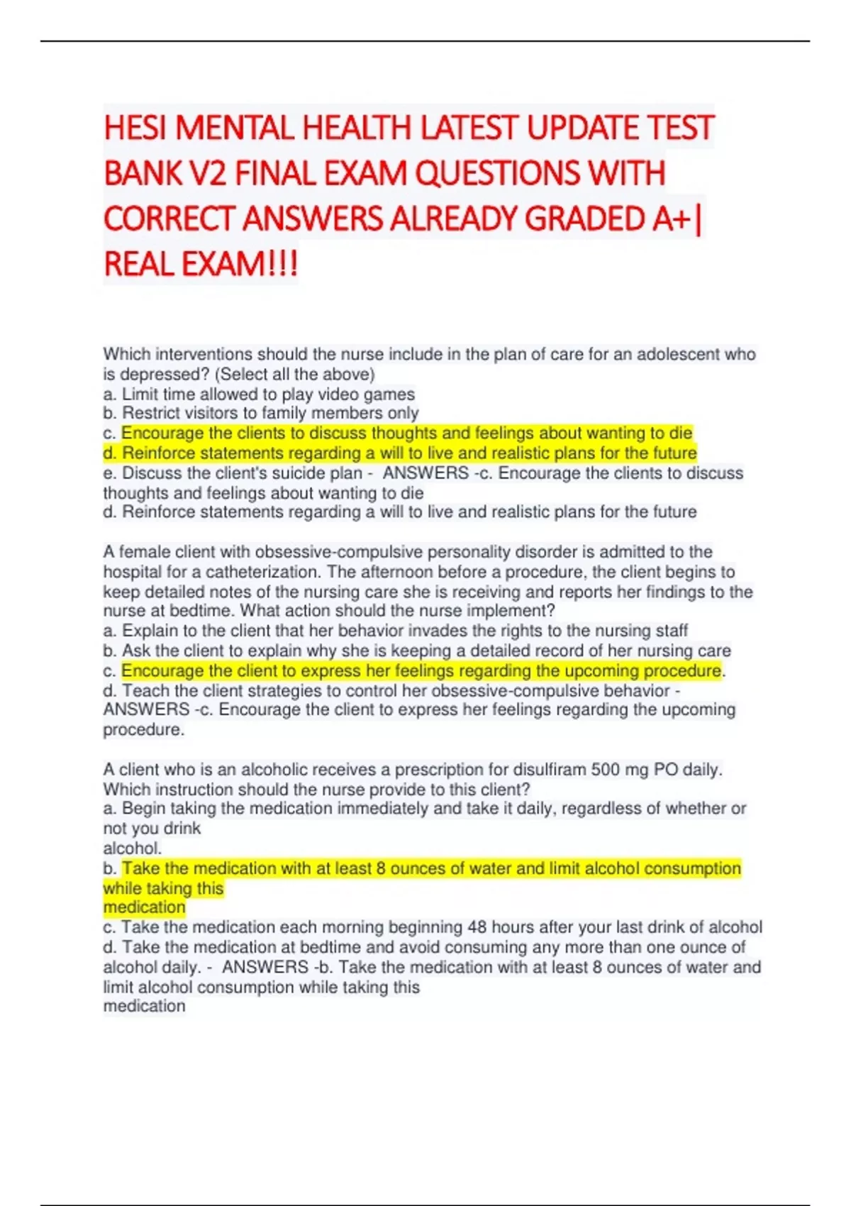 HESI MENTAL HEALTH LATEST UPDATE TEST BANK V2 FINAL EXAM QUESTIONS WITH CORRECT ANSWERS ALREADY GRADED A+| REAL EXAM!!! HESI MENTAL HEALTH LATEST UPDATE TEST BANK V2 FINAL EXAM QUESTIONS WITH CORRECT ANSWERS ALREADY GRADED A+| REAL EXAM!!! HESI MENTAL HEALTH LATEST UPDATE TEST BANK V2 FINAL EXAM QUESTIONS WITH CORRECT ANSWERS ALREADY GRADED A+| REAL EXAM!!! HESI MENTAL HEALTH LATEST UPDATE TEST BANK V2 FINAL EXAM QUESTIONS WITH CORRECT ANSWERS ALREADY GRADED A+| REAL EXAM!!! HESI MENTAL HEALTH LATEST UPDATE TEST BANK V2 FINAL EXAM QUESTIONS WITH CORRECT ANSWERS ALREADY GRADED A+| REAL EXAM!!! HESI MENTAL HEALTH LATEST UPDATE TEST BANK V2 FINAL EXAM QUESTIONS WITH CORRECT ANSWERS ALREADY GRADED A+| REAL EXAM!!! HESI MENTAL HEALTH LATEST UPDATE TEST BANK V2 FINAL EXAM QUESTIONS WITH CORRECT ANSWERS ALREADY GRADED A+| REAL EXAM!!! HESI MENTAL HEALTH LATEST UPDATE TEST BANK V2 FINAL EXAM QUESTIONS WITH CORRECT ANSWERS ALREADY GRADED A+| REAL EXAM!!!