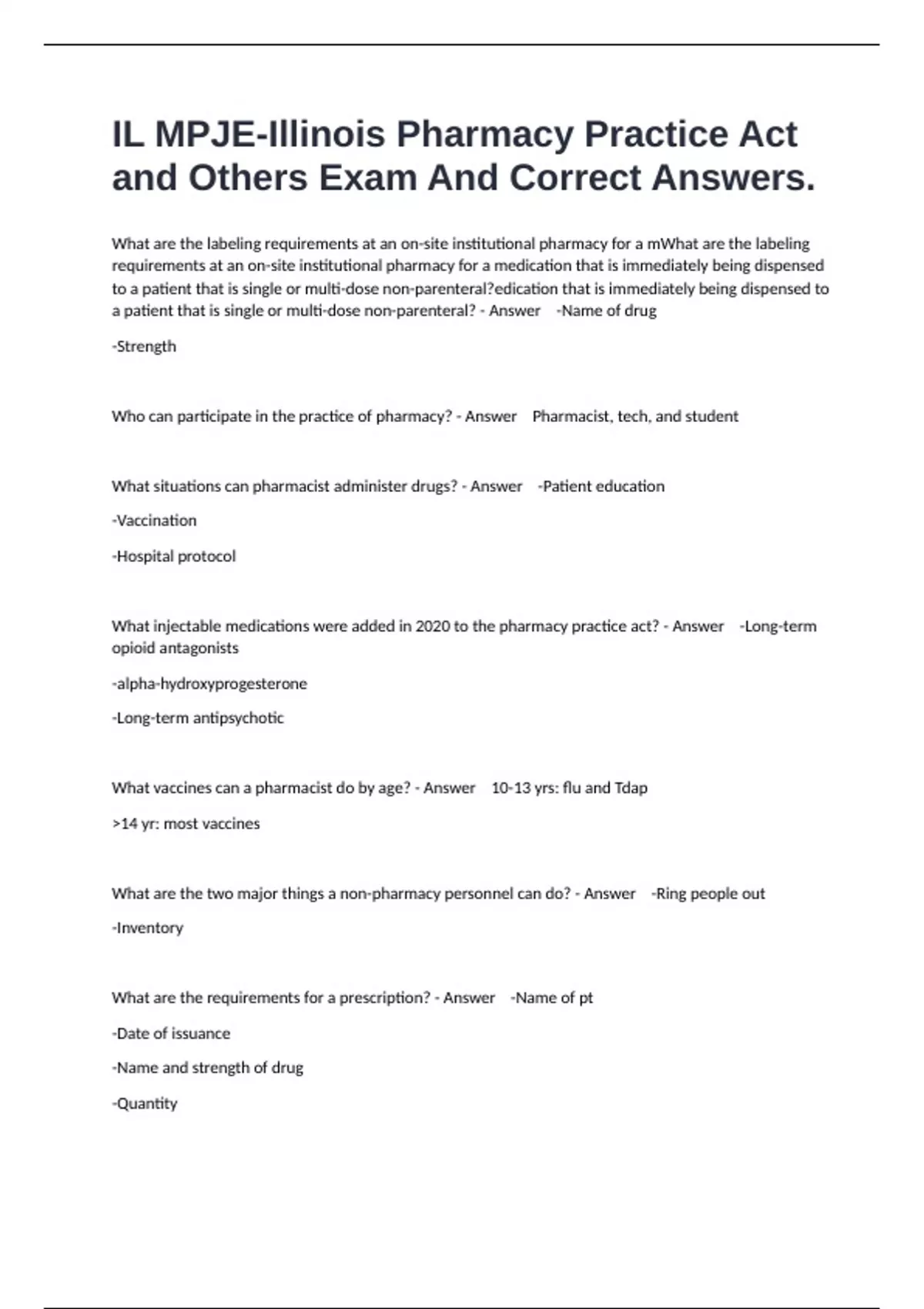 What are the labeling requirements at an on-site institutional pharmacy for a mWhat are the labeling requirements at an on-site institutional pharmacy for a medication that is immediately being dispensed to a patient that is single or multi-dose non-parenteral?edication that is immediately being dispensed to a patient that is single or multi-dose non-parenteral? - Answer -Name of drug -Strength Who can participate in the practice of pharmacy? - Answer Pharmacist, tech, and student What situations can pharmacist administer drugs? - Answer -Patient education -Vaccination -Hospital protocol What injectable medications were added in 2020 to the pharmacy practice act? - Answer -Long-term opioid antagonists -alpha-hydroxyprogesterone -Long-term antipsychotic What vaccines can a pharmacist do by age? - Answer 10-13 yrs: flu and Tdap >14 yr: most vaccines What are the two major things a non-pharmacy personnel can do? - Answer -Ring people out -Inventory What are the requirements for a prescription? - Answer -Name of pt -Date of issuance -Name and strength of drug