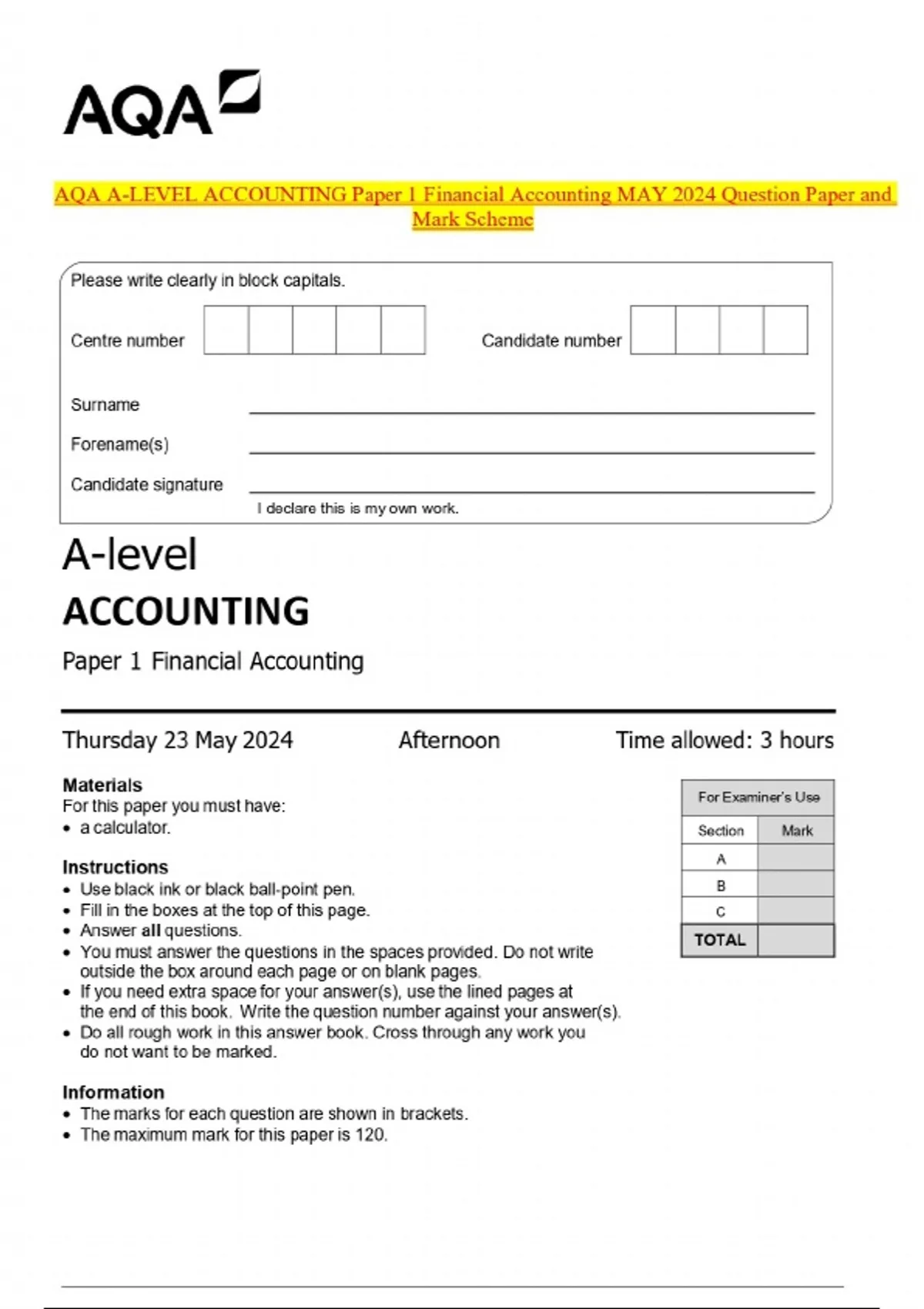 AQA A-LEVEL ACCOUNTING Paper 1 Financial Accounting MAY 2024 Question Paper and Mark Scheme