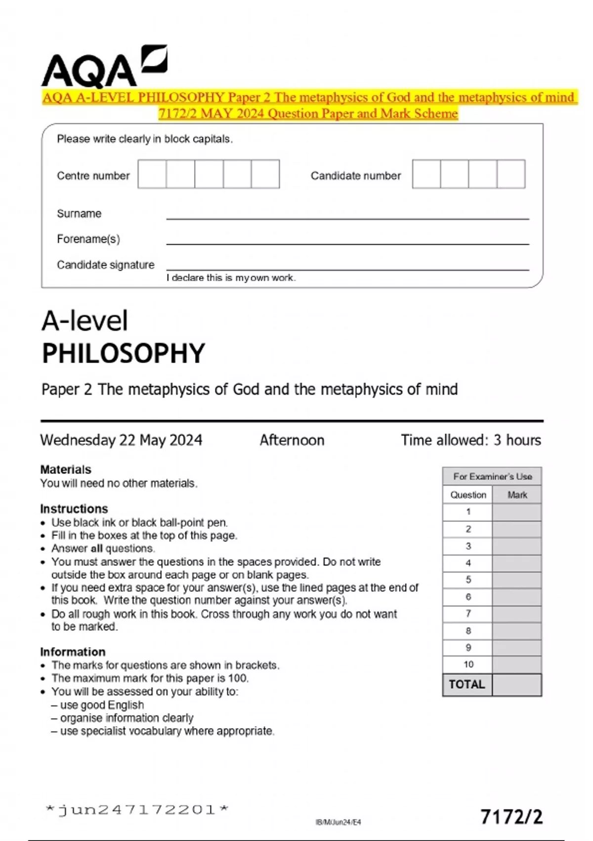 AQA A-LEVEL PHILOSOPHY Paper 2 The metaphysics of God and the metaphysics of mind 7172/2 MAY 2024 Question Paper and Mark Scheme