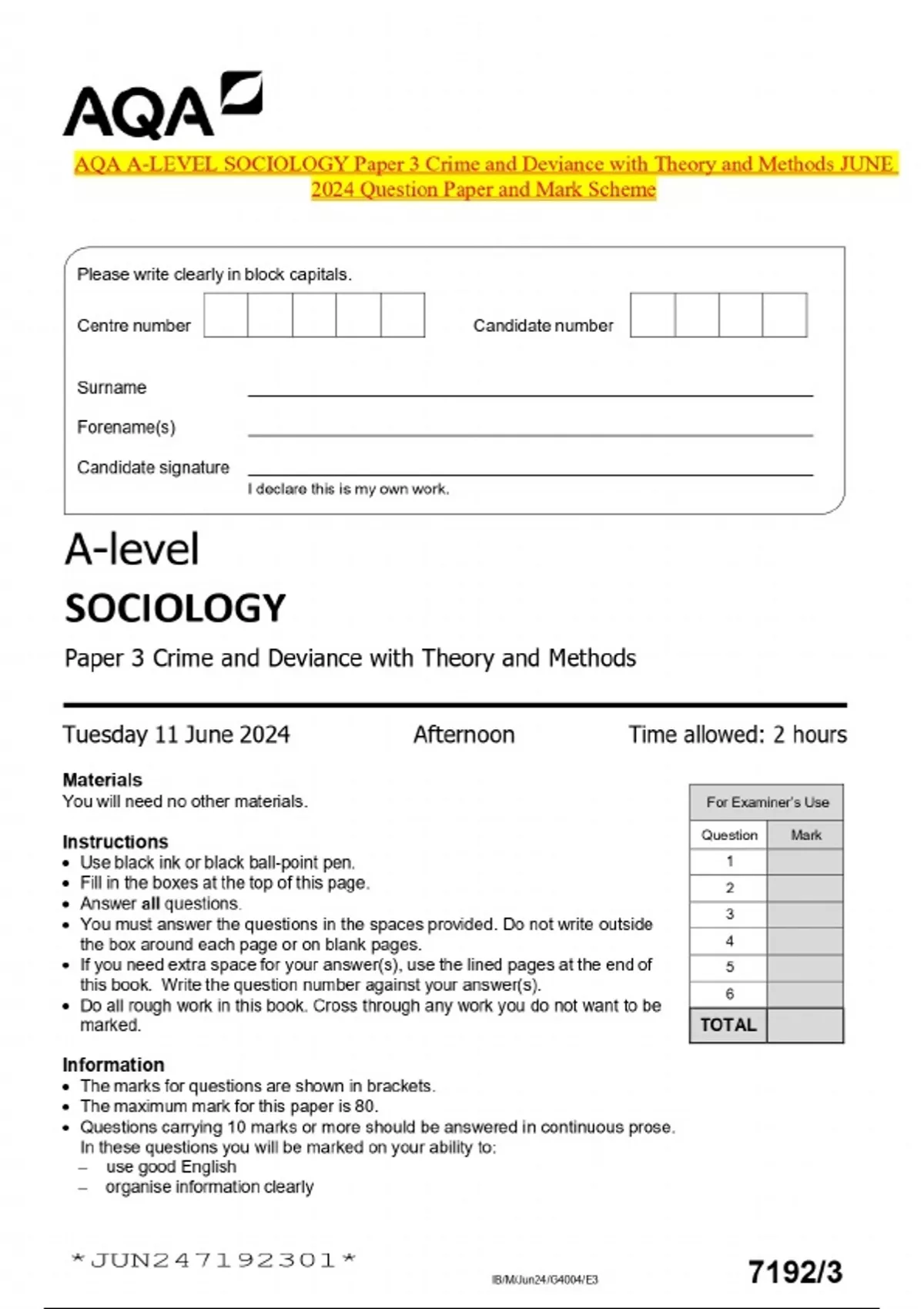 AQA A-LEVEL SOCIOLOGY Paper 3 Crime and Deviance with Theory and Methods JUNE 2024 Question Paper and Mark Scheme