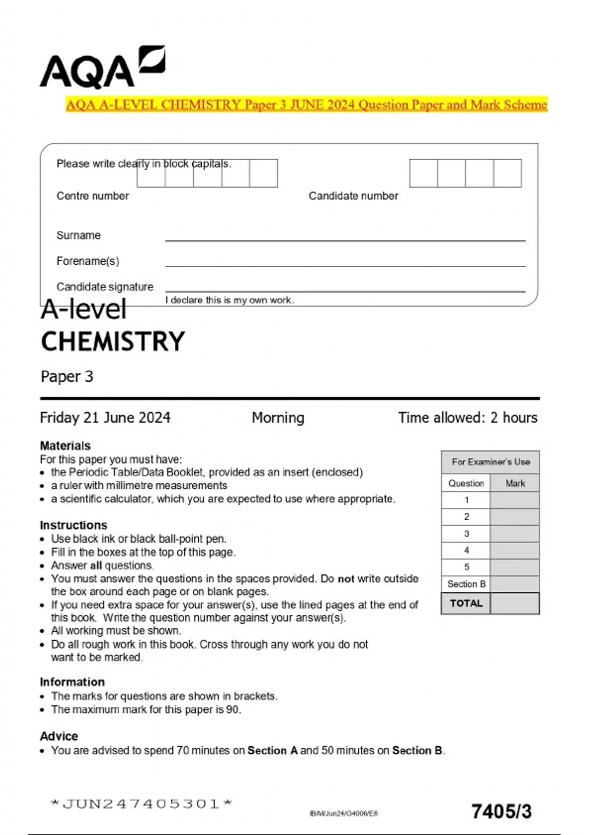 AQA A-LEVEL CHEMISTRY Paper 3 JUNE 2024 Question Paper and Mark Scheme