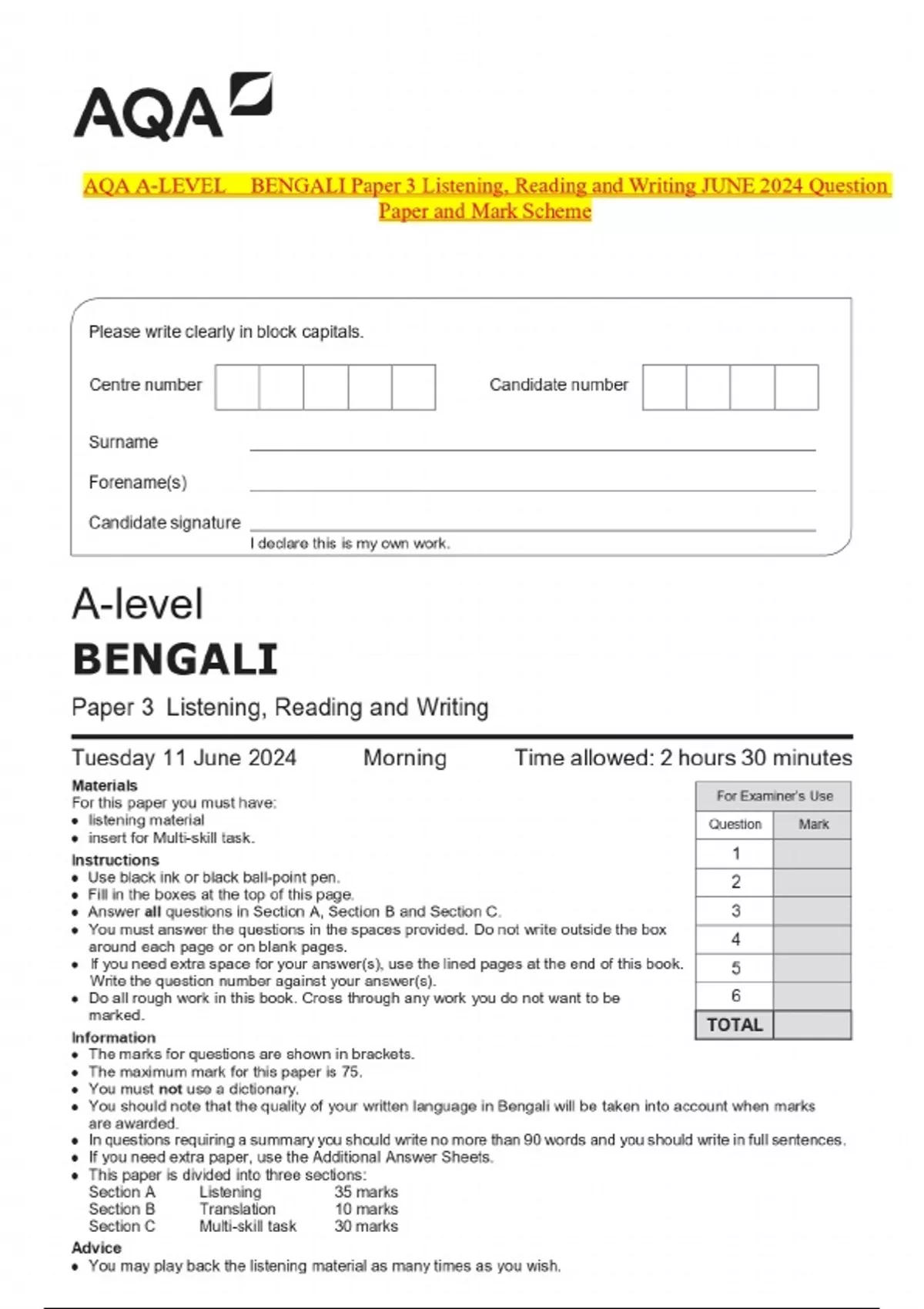 QA A-LEVEL BENGALI Paper 3 Listening, Reading and Writing JUNE 2024 Question Paper and Mark Scheme