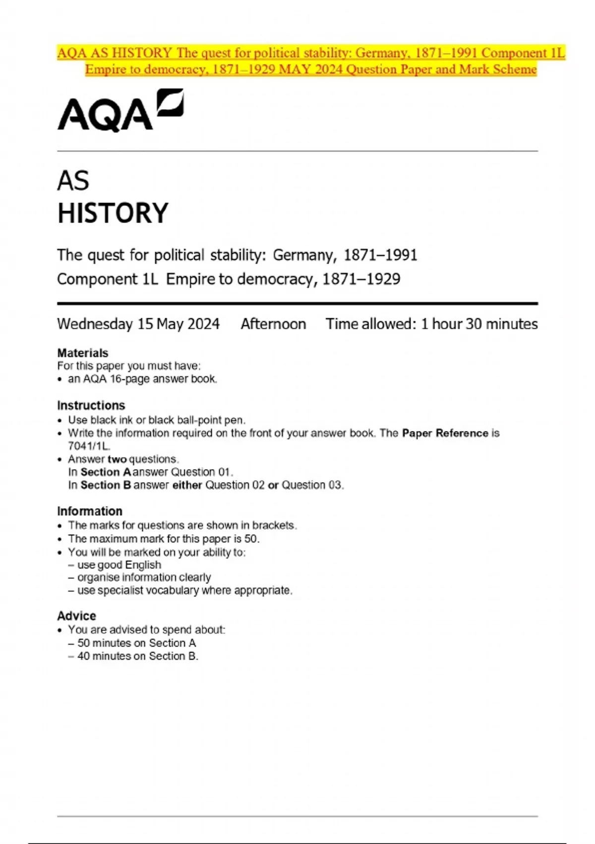 AQA AS HISTORY The quest for political stability: Germany, 1871–1991 Component 1L Empire to democracy, 1871–1929 MAY 2024 Question Paper and Mark Scheme