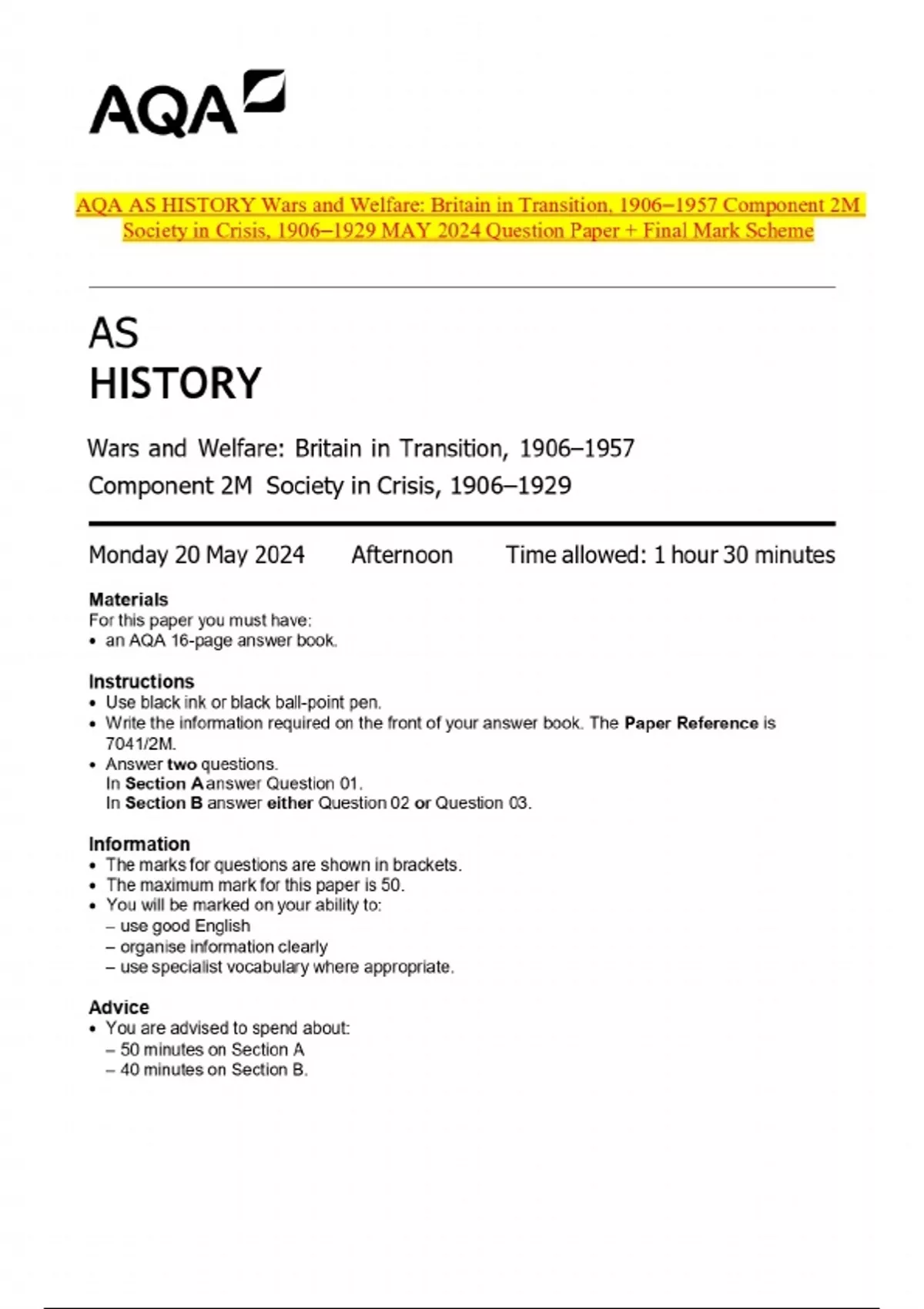 AQA AS HISTORY Wars and Welfare: Britain in Transition, 1906–1957 Component 2M Society in Crisis, 1906–1929 MAY 2024 Question Paper + Final Mark Scheme