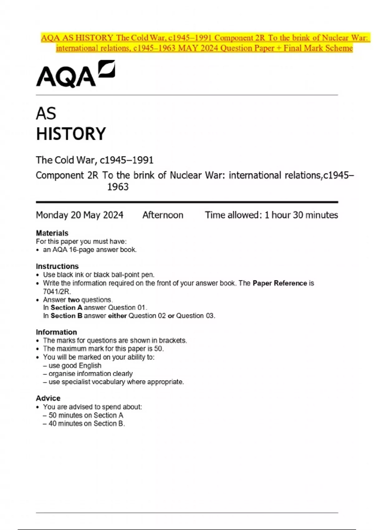 AQA AS HISTORY The Cold War, c1945–1991 Component 2R To the brink of Nuclear War: international relations, c1945–1963 MAY 2024 Question Paper + Final Mark Scheme