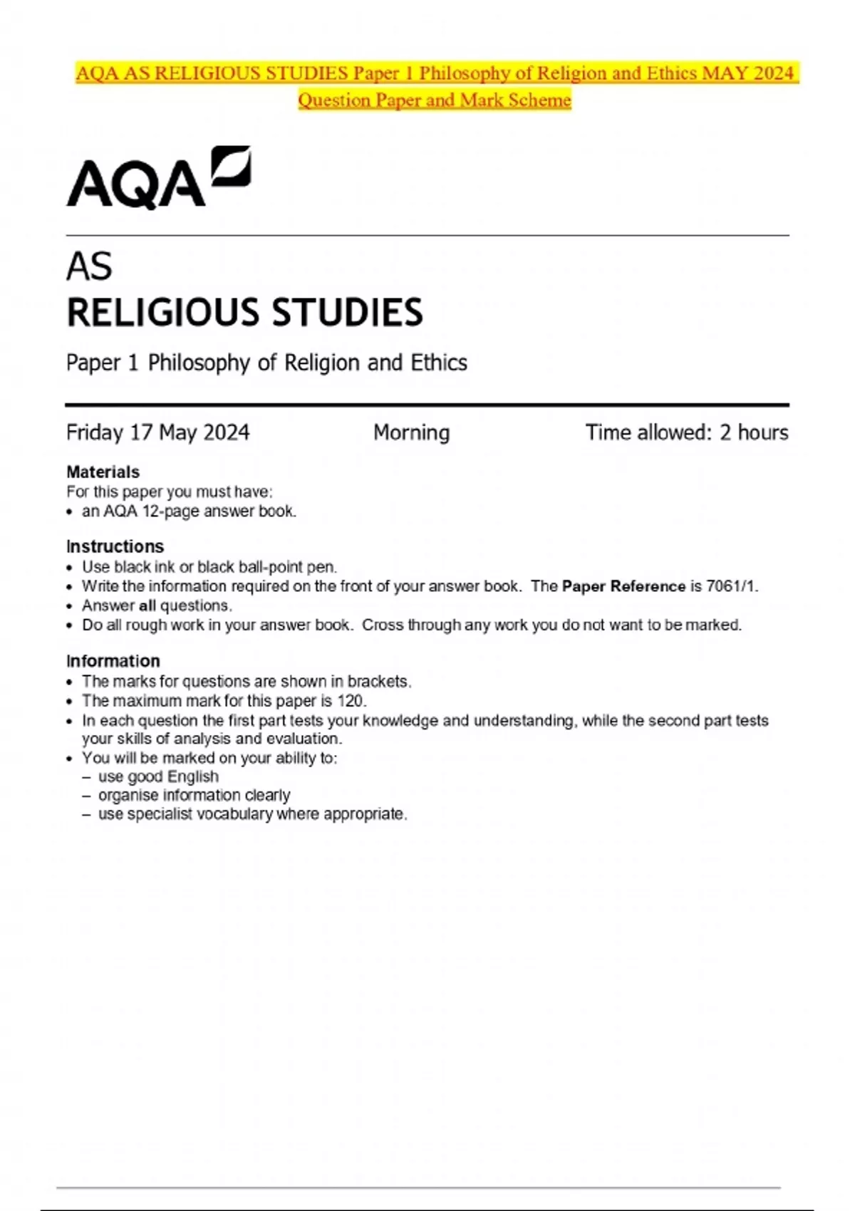 AQA AS RELIGIOUS STUDIES Paper 1 Philosophy of Religion and Ethics MAY 2024 Question Paper and Mark Scheme