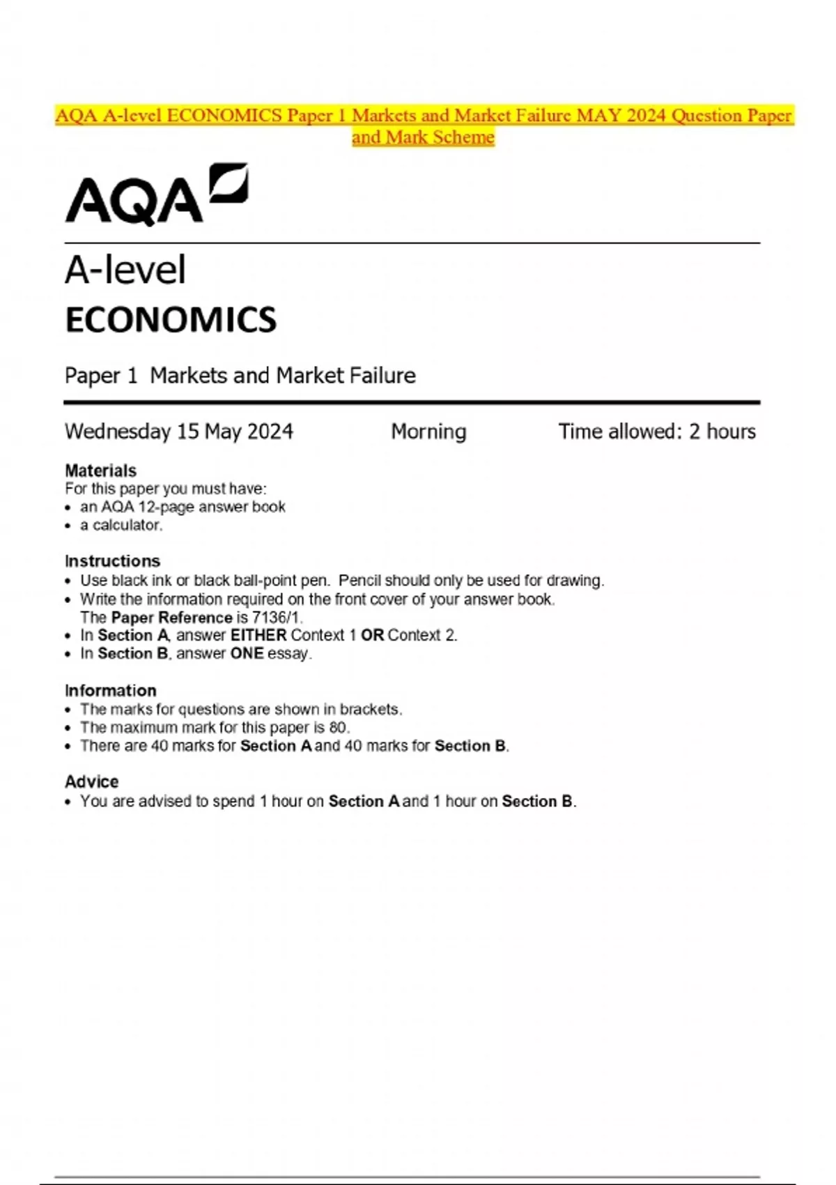 AQA A-level ECONOMICS Paper 1 Markets and Market Failure MAY 2024 Question Paper and Mark Scheme