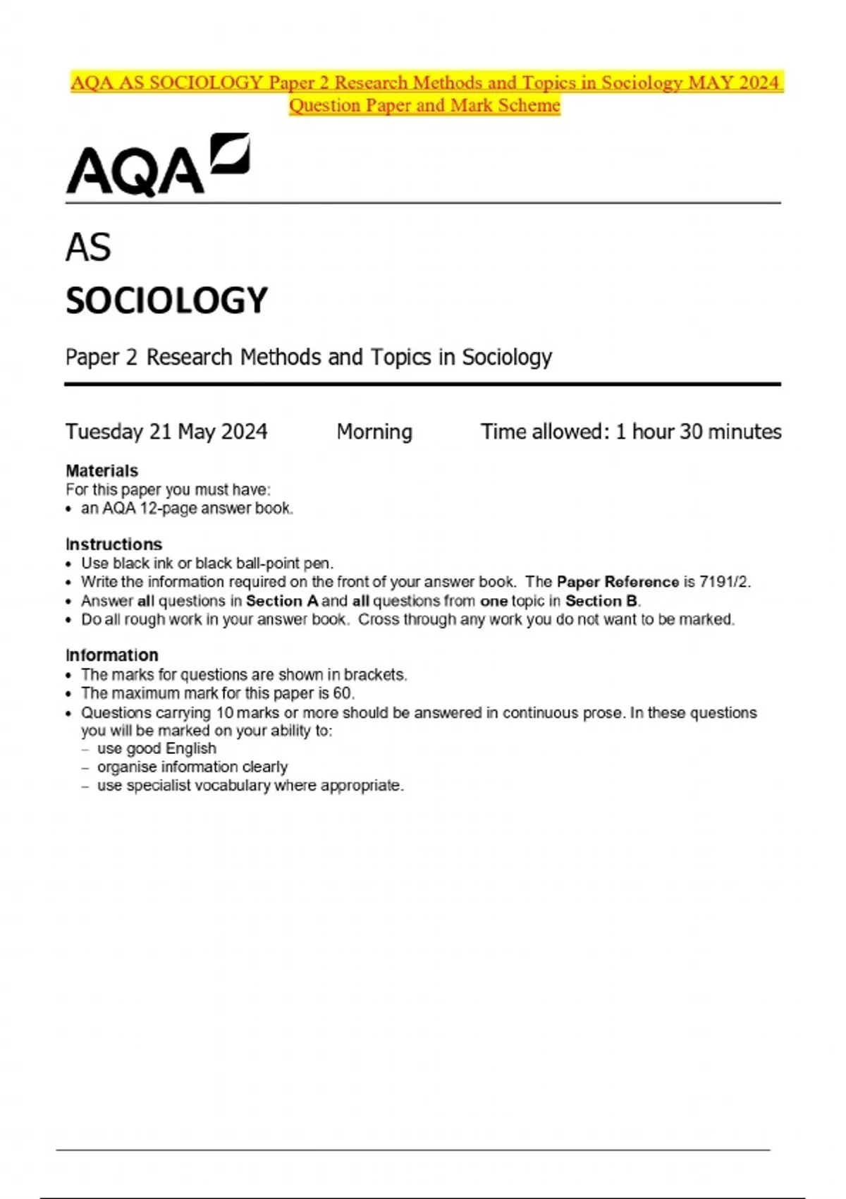 AQA AS SOCIOLOGY Paper 2 Research Methods and Topics in Sociology MAY 2024 Question Paper and Mark Scheme
