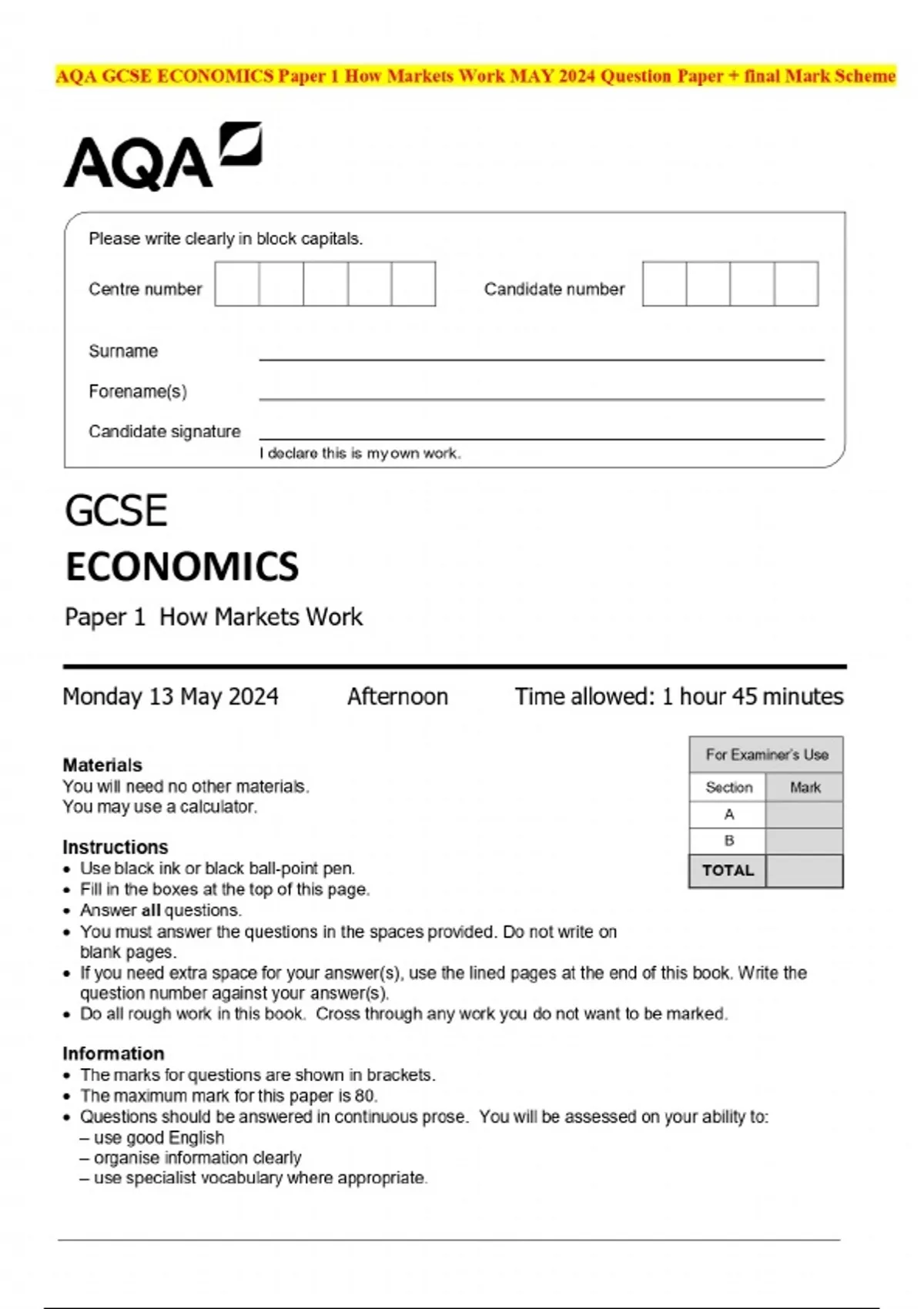 AQA GCSE ECONOMICS Paper 1 How Markets Work MAY 2024 Question Paper + final Mark Scheme