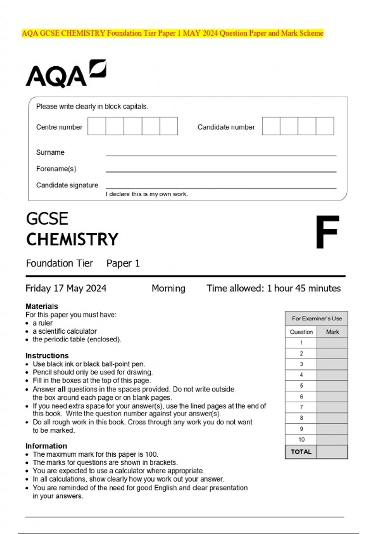 AQA GCSE CHEMISTRY Foundation Tier Paper 1 MAY 2024 Question Paper and Mark Scheme