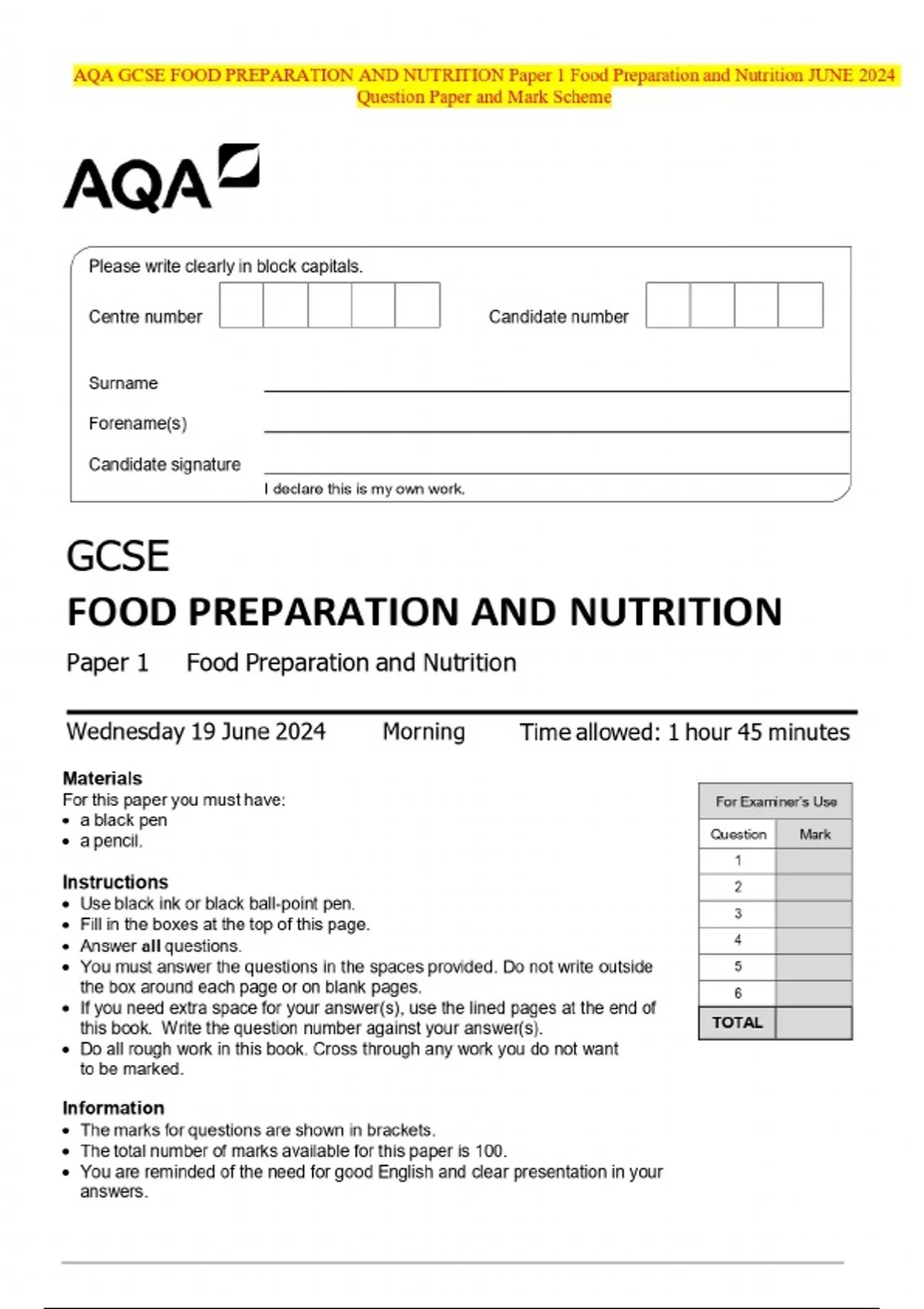 AQA GCSE FOOD PREPARATION AND NUTRITION Paper 1 Food Preparation and Nutrition JUNE 2024 Question Paper and Mark Scheme