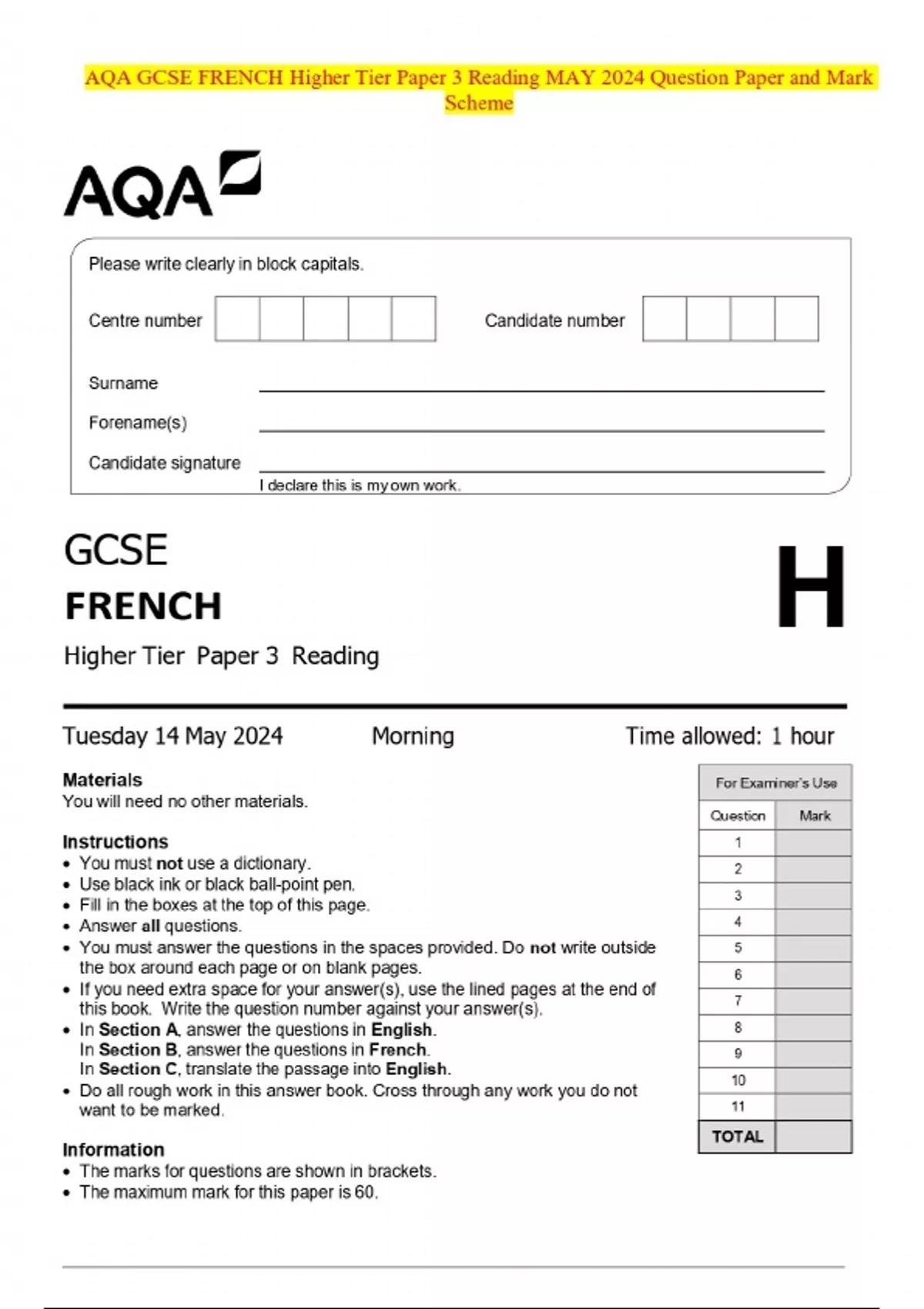 AQA GCSE FRENCH Higher Tier Paper 3 Reading MAY 2024 Question Paper and Mark Scheme