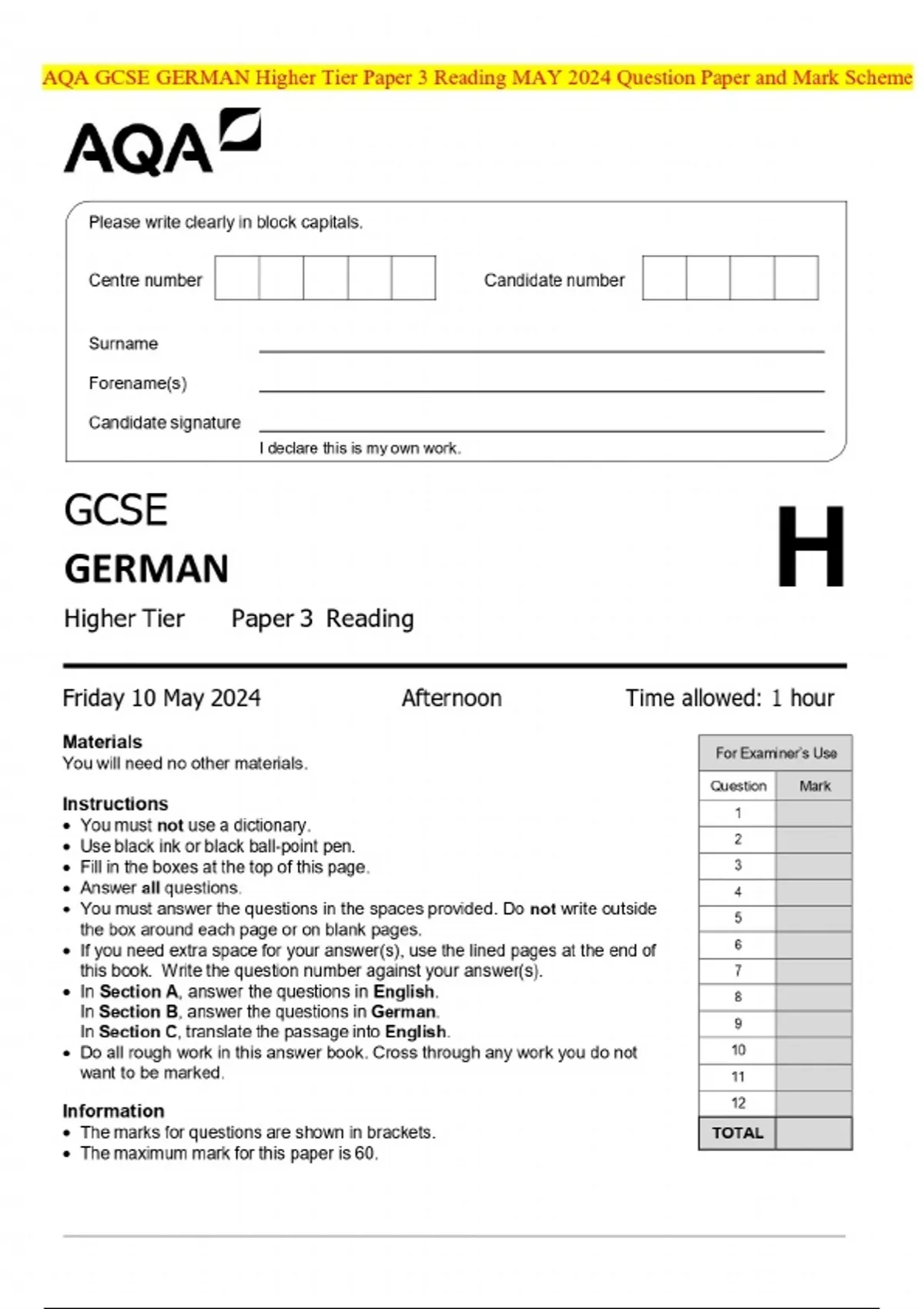AQA GCSE GERMAN Higher Tier Paper 3 Reading MAY 2024 Question Paper and Mark Scheme