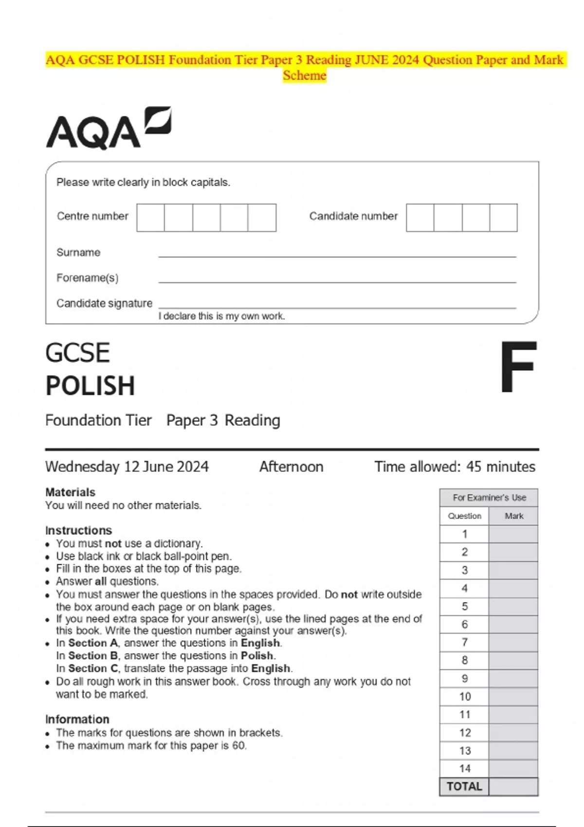 AQA GCSE POLISH Foundation Tier Paper 3 Reading JUNE 2024 Question Paper and Mark Scheme