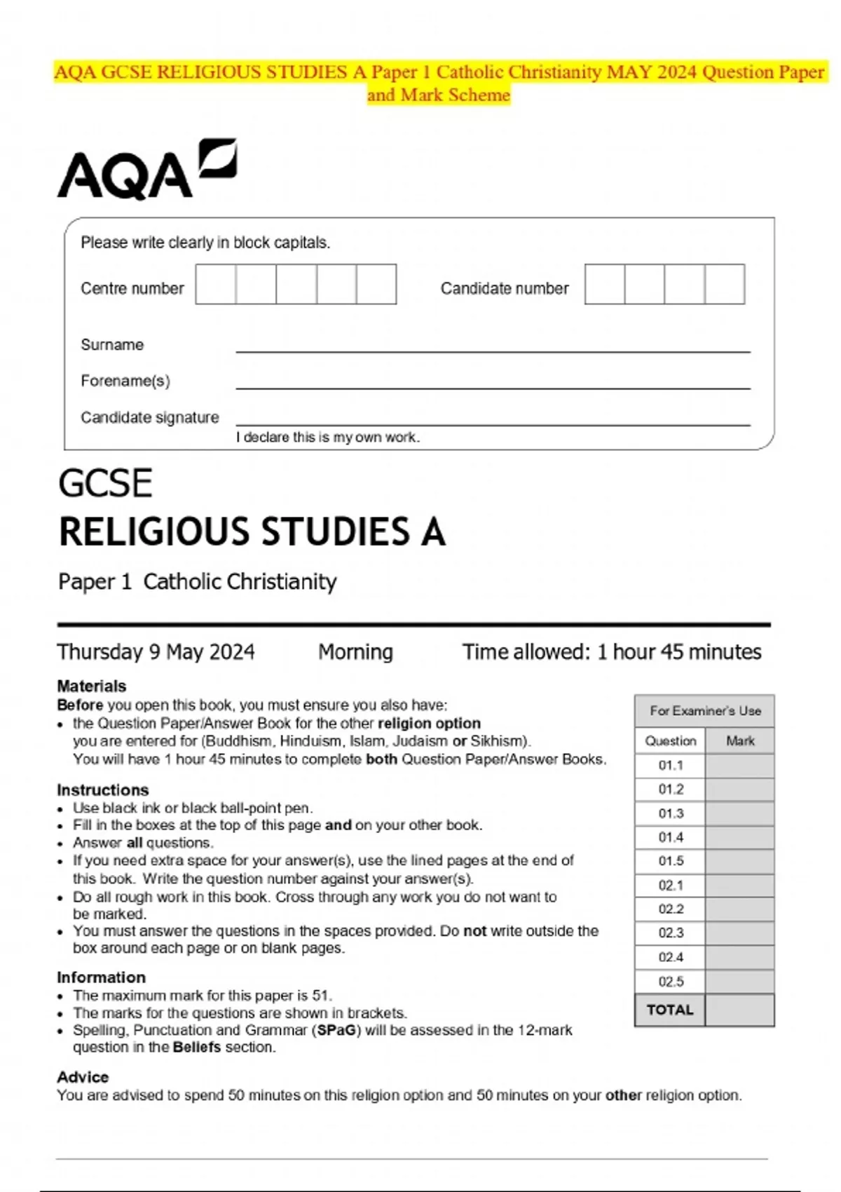 AQA GCSE RELIGIOUS STUDIES A Paper 1 Catholic Christianity MAY 2024 Question Paper and Mark Scheme