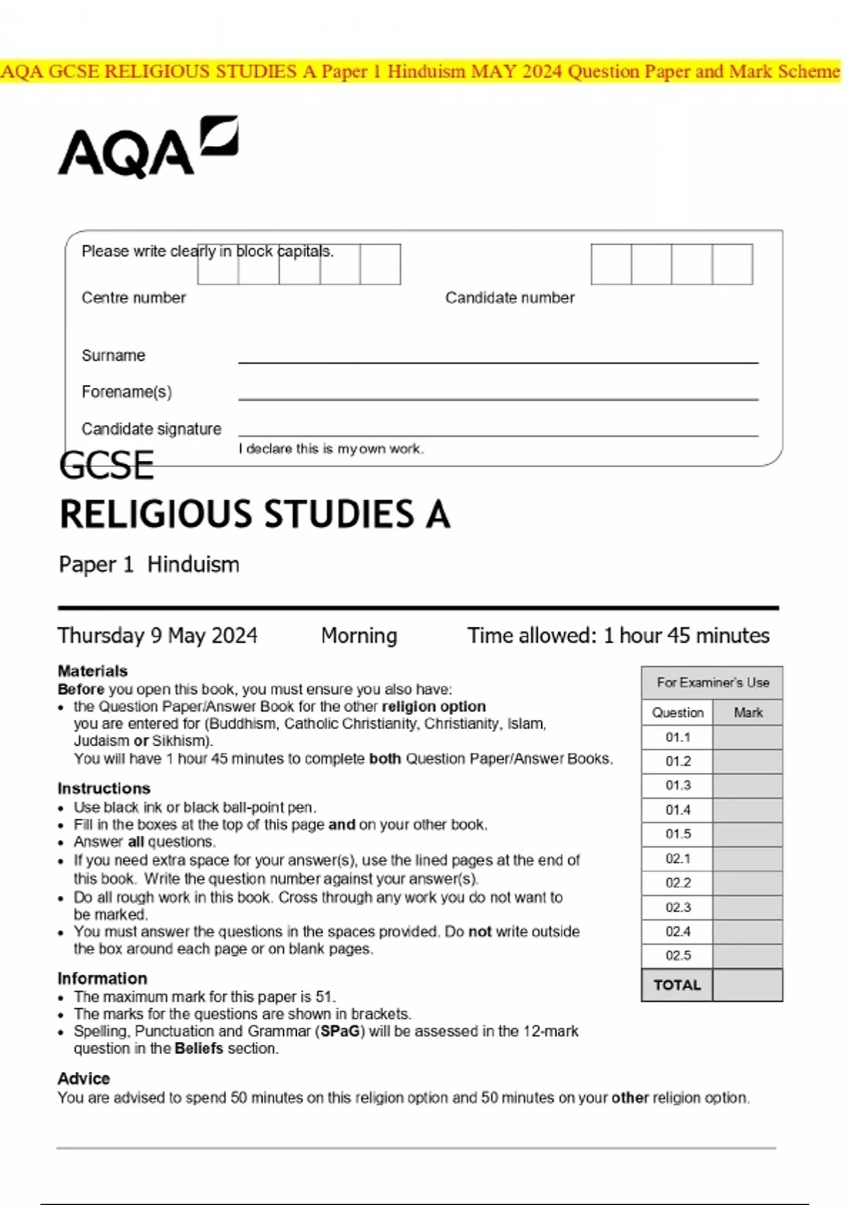 AQA GCSE RELIGIOUS STUDIES A Paper 1 Hinduism MAY 2024 Question Paper and Mark Scheme