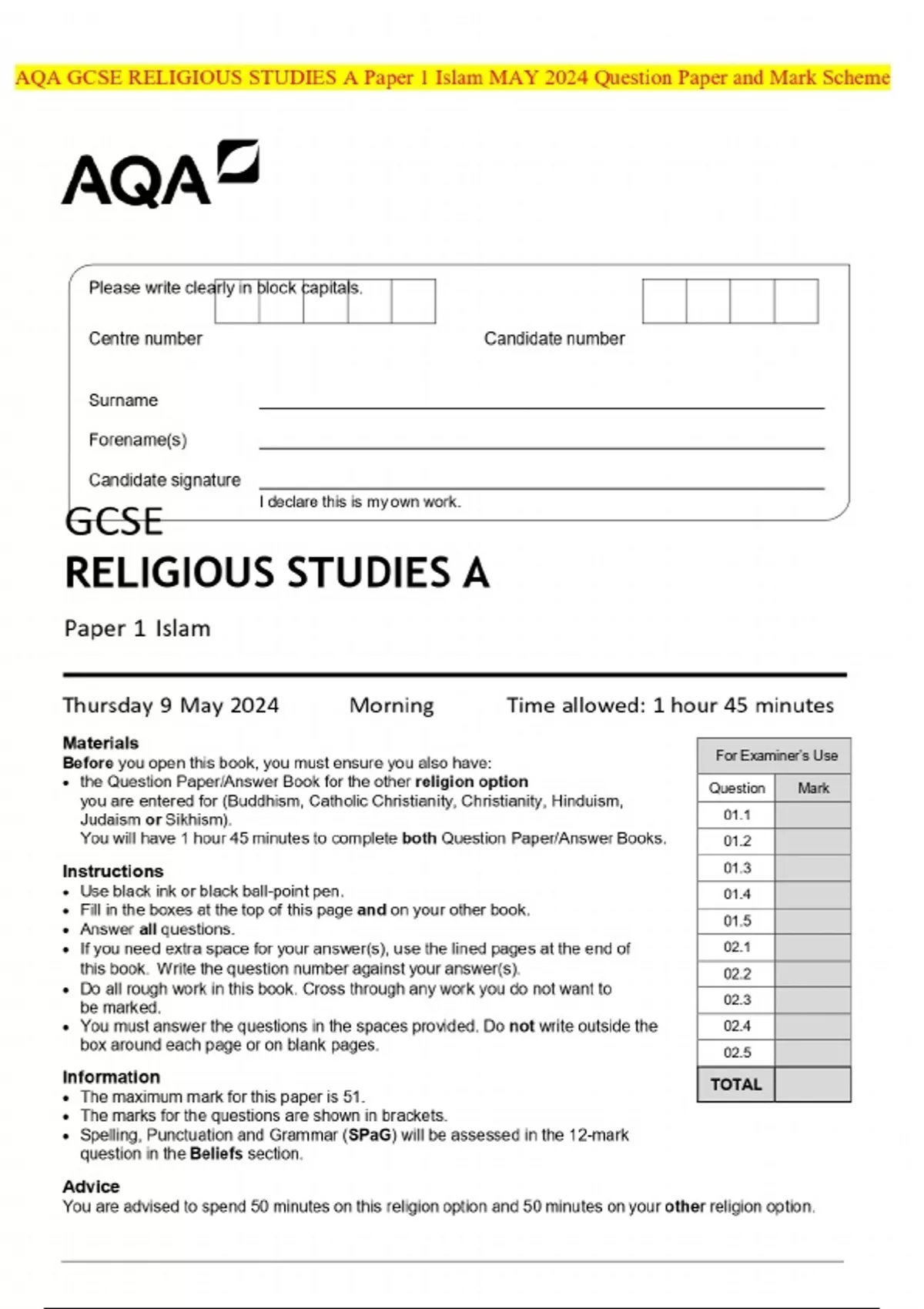AQA GCSE RELIGIOUS STUDIES A Paper 1 Islam MAY 2024 Question Paper and Mark Scheme